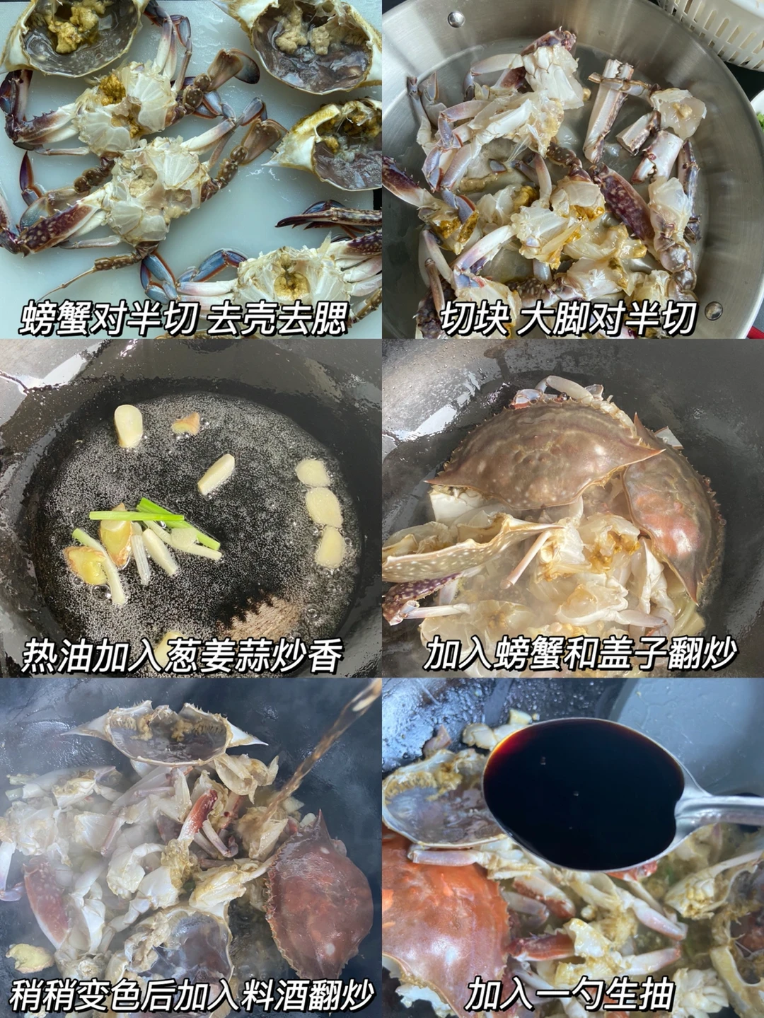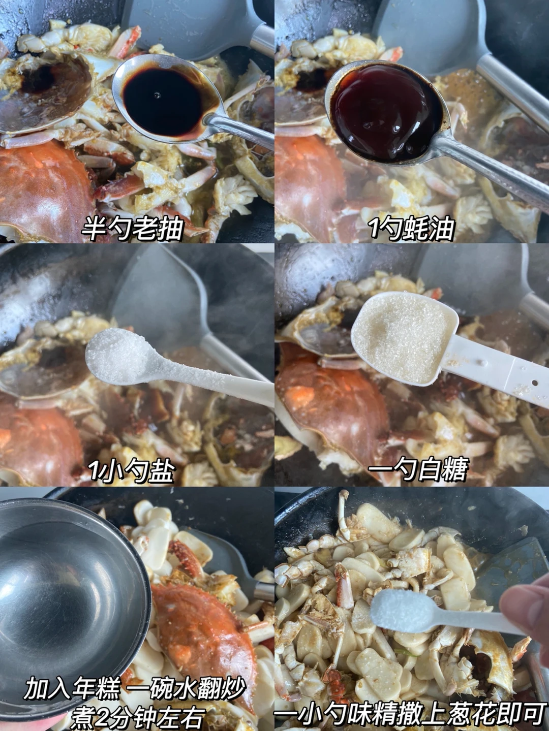 南方人一过禁渔期就会想吃的一道主食 小时候每天吵着让我妈给我做😋 准备食材✨✨✨✨✨ 梭子蟹3只 年糕 葱姜蒜 制作方法✨✨✨✨✨ 1️⃣螃蟹对半切 去壳去腮 切块 大脚对半切 2️⃣热油加入葱姜蒜炒香 加入螃蟹和盖子翻炒 稍稍变色后加入料酒翻炒一下 3️⃣加入一勺生抽➕半勺老抽 ➕一勺蚝油➕一小勺盐➕一勺白糖(根据年糕量增减) 4️⃣加年糕 一碗小水 煮2分钟左右加一小勺味精 出锅撒上葱花即可 超鲜美的一道主食 做了就不会失望 年夜饭做一道大家一起吃 集美们🐛呀