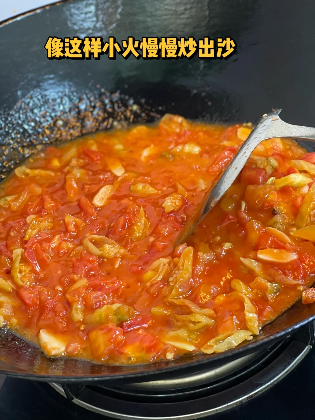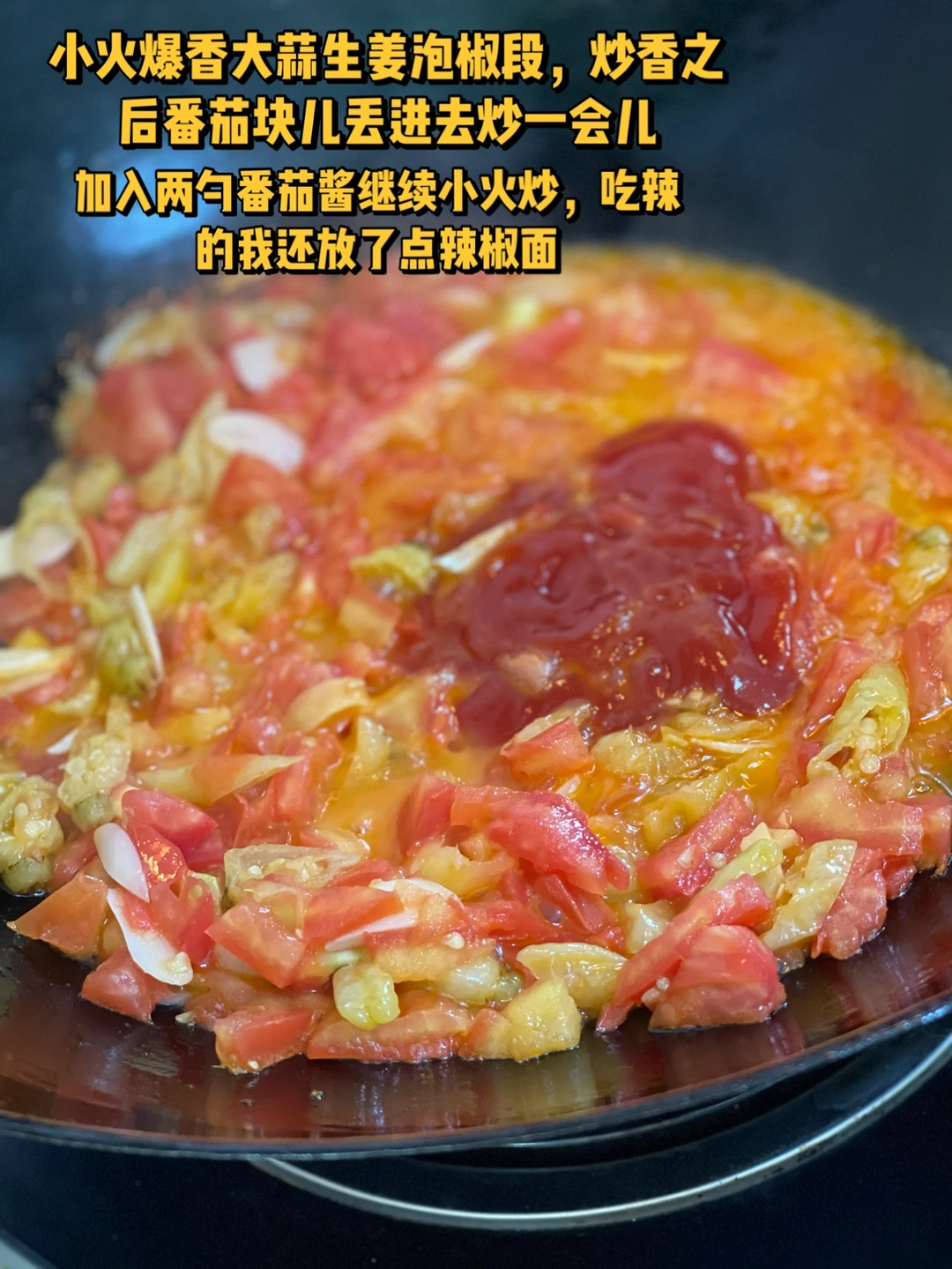3. 小火爆香大蒜生姜泡椒段,炒香之后番茄块儿丢进去炒一会儿,加入两勺番茄酱继续小火炒,吃辣的我还放了点辣椒面