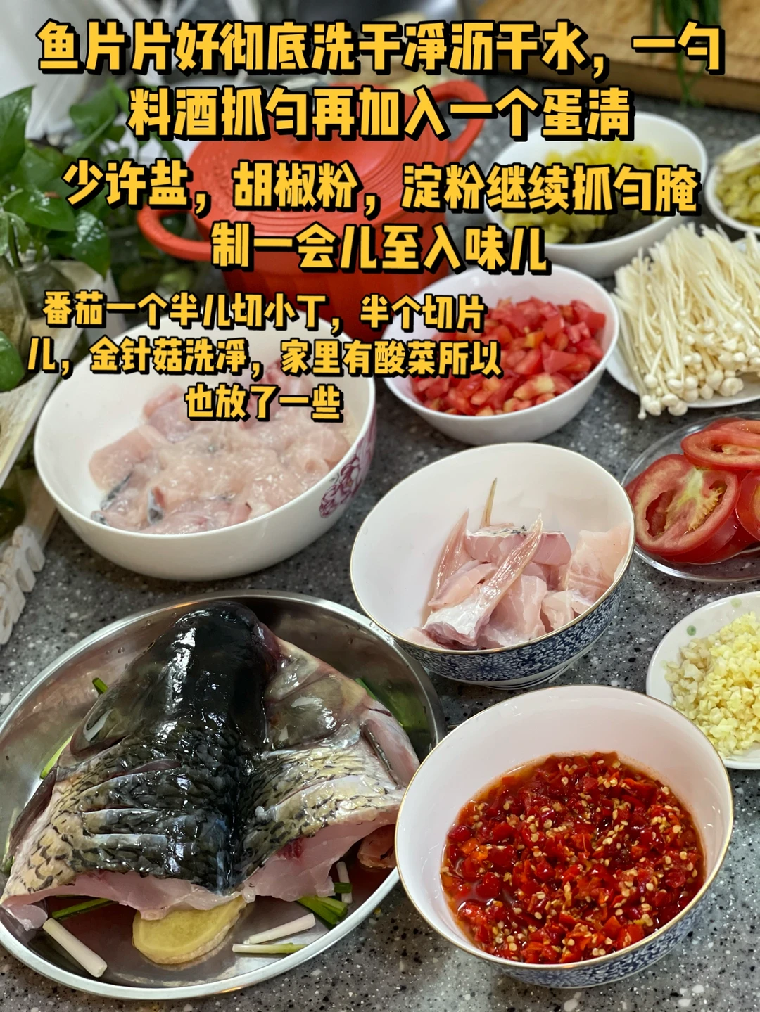 1.鱼片片好彻底洗干净沥干水,一勺料酒抓匀再加入一个蛋清,少许盐,胡椒粉,淀粉继续抓匀腌制一会儿至入味儿