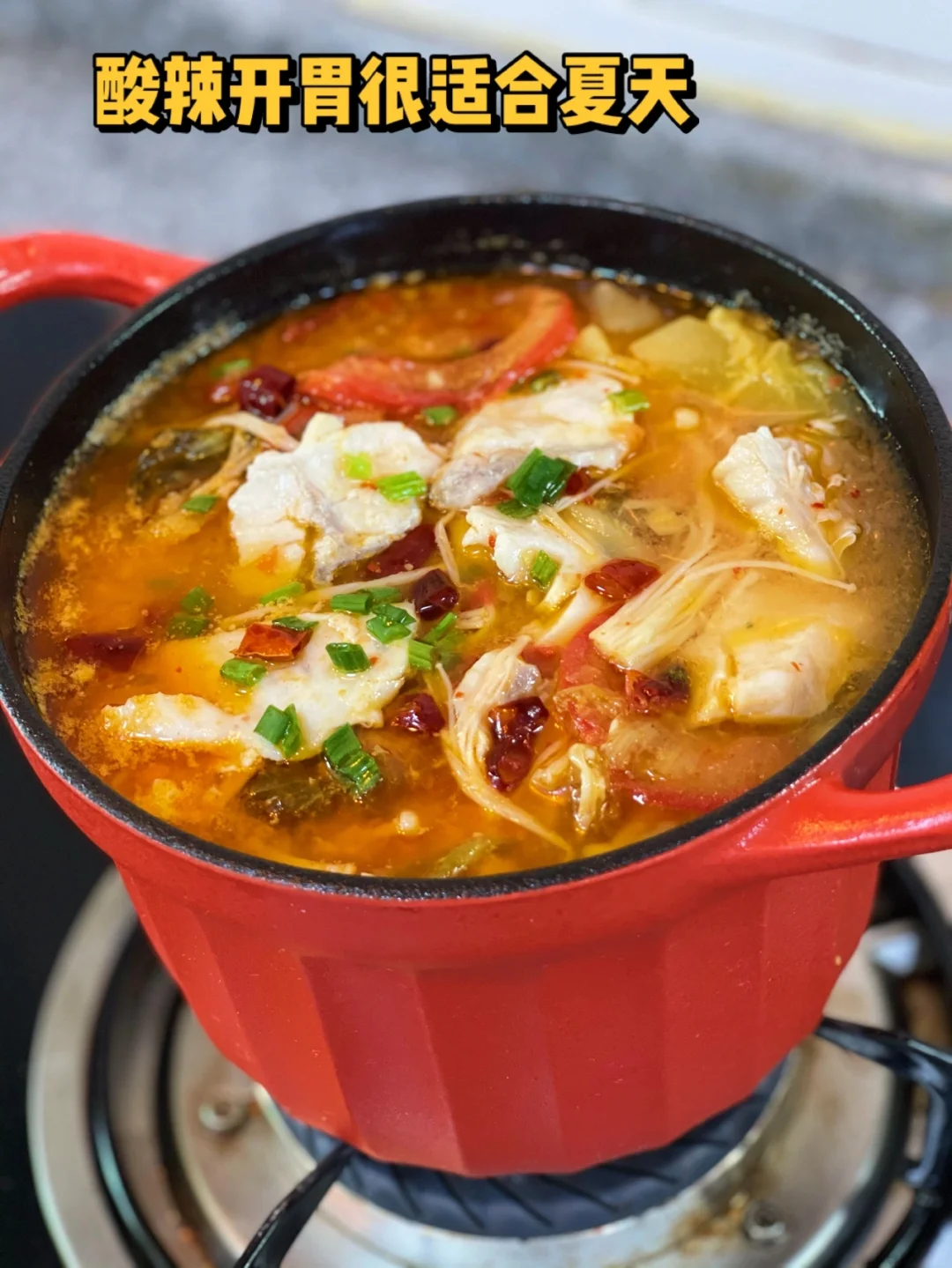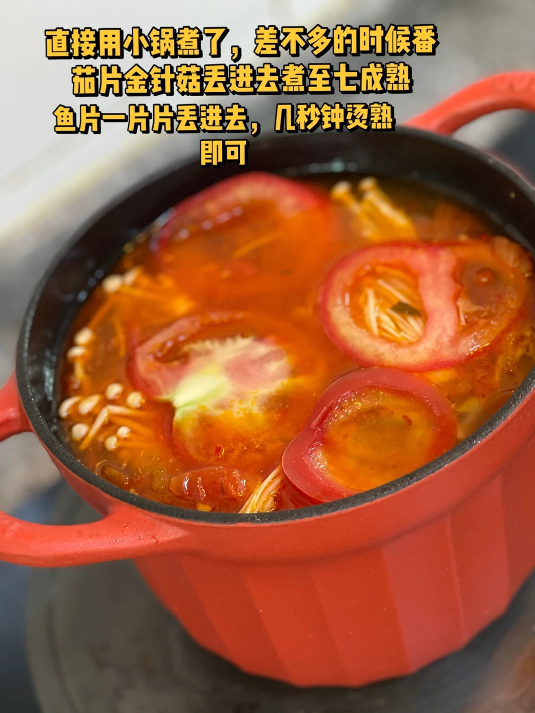 5. 直接用小锅煮了,差不多的时候番茄片金针菇丢进去煮至七成熟,鱼片一片片丢进去,几秒钟烫熟即可