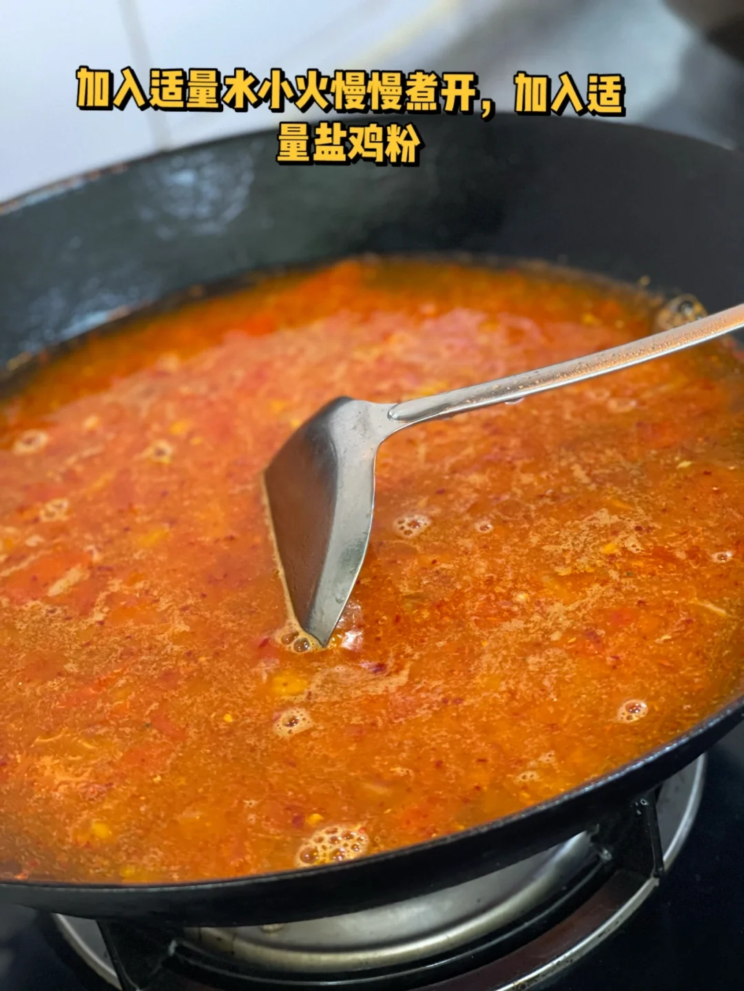 4. 像这样小火慢慢炒出沙,加入适量水小火慢慢煮开,加入适量盐鸡粉