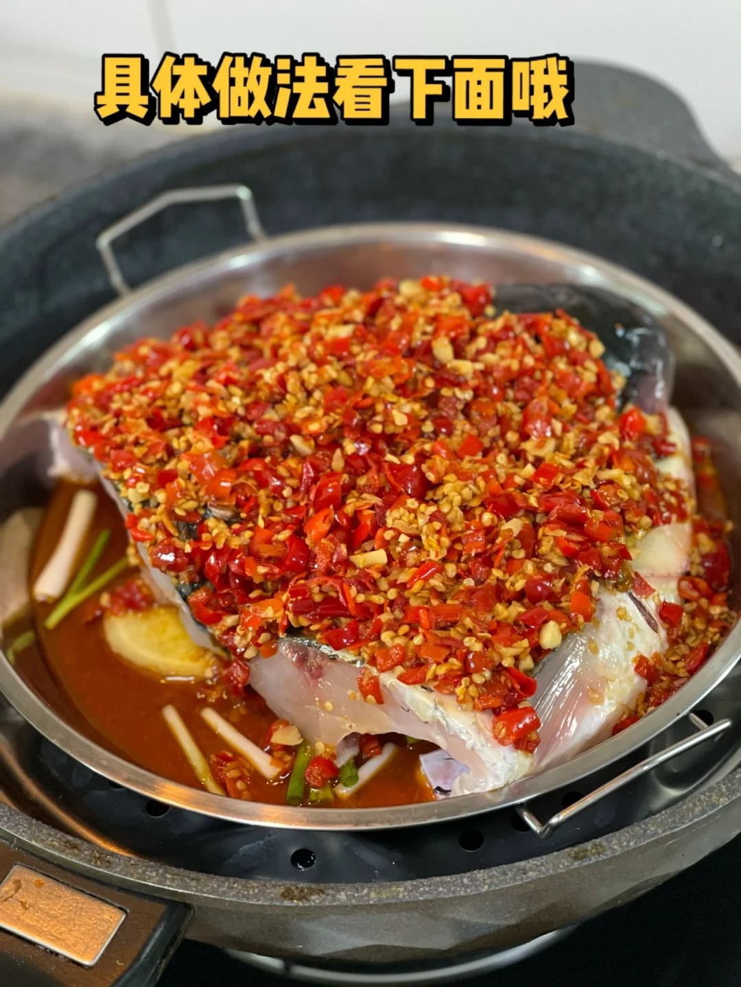 4.然后炒好的剁椒酱放在鱼头上面,记住的是下面的水一次性放足,中火蒸大概25分钟左右,时间不绝对