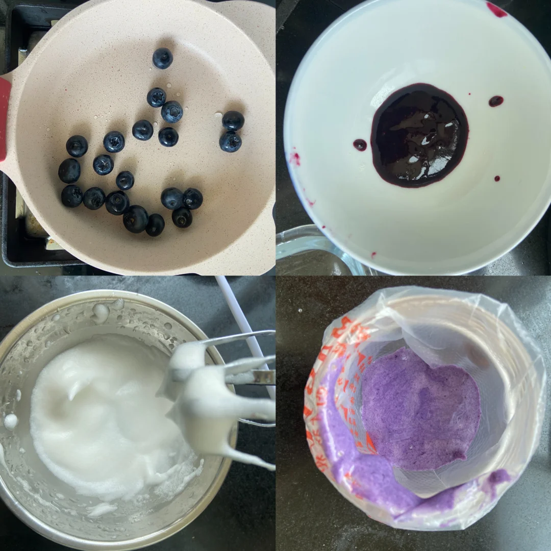 3️⃣过滤岀蓝莓汁倒入蛋白霜里 倒入15g奶粉 玉米淀粉翻拌均匀