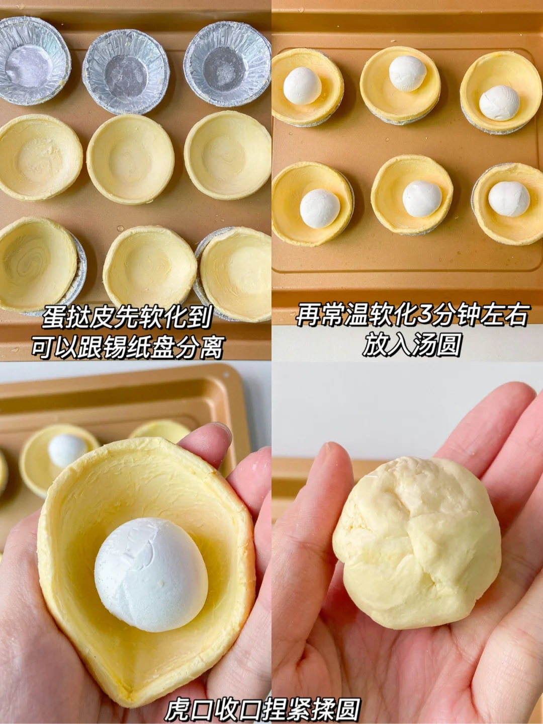 1️⃣蛋挞皮先软化到可以跟锡纸盘分离 再常温软化3分钟左右放入汤圆