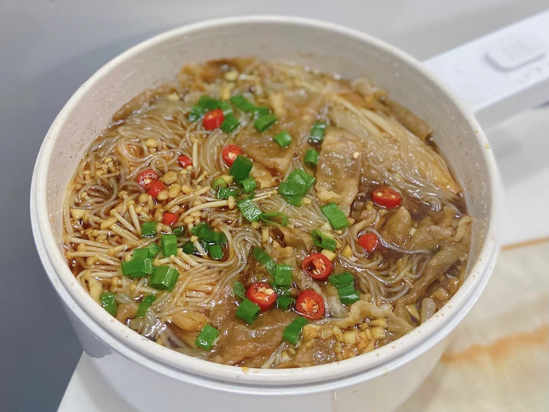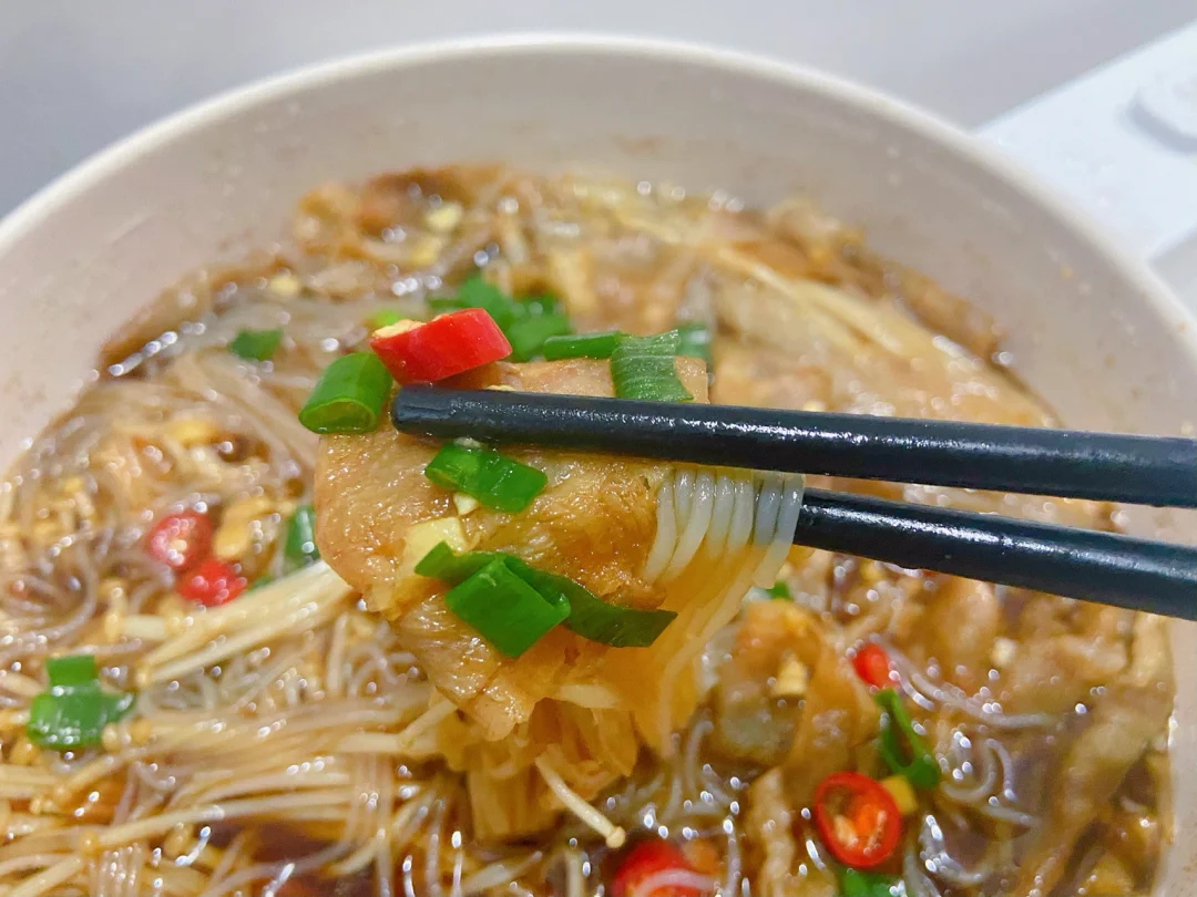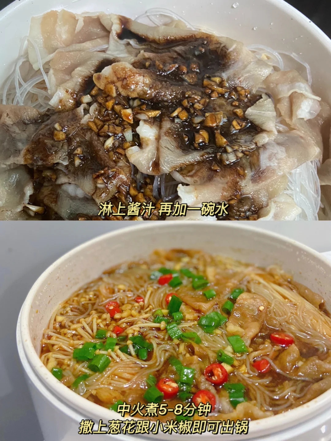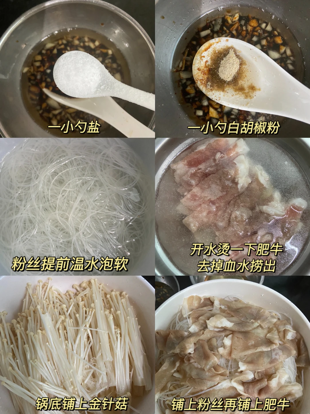 4️⃣锅底铺上金针菇 再放上泡好的粉丝 肥牛 淋上酱汁 再加一碗水 中火煮5-8分钟