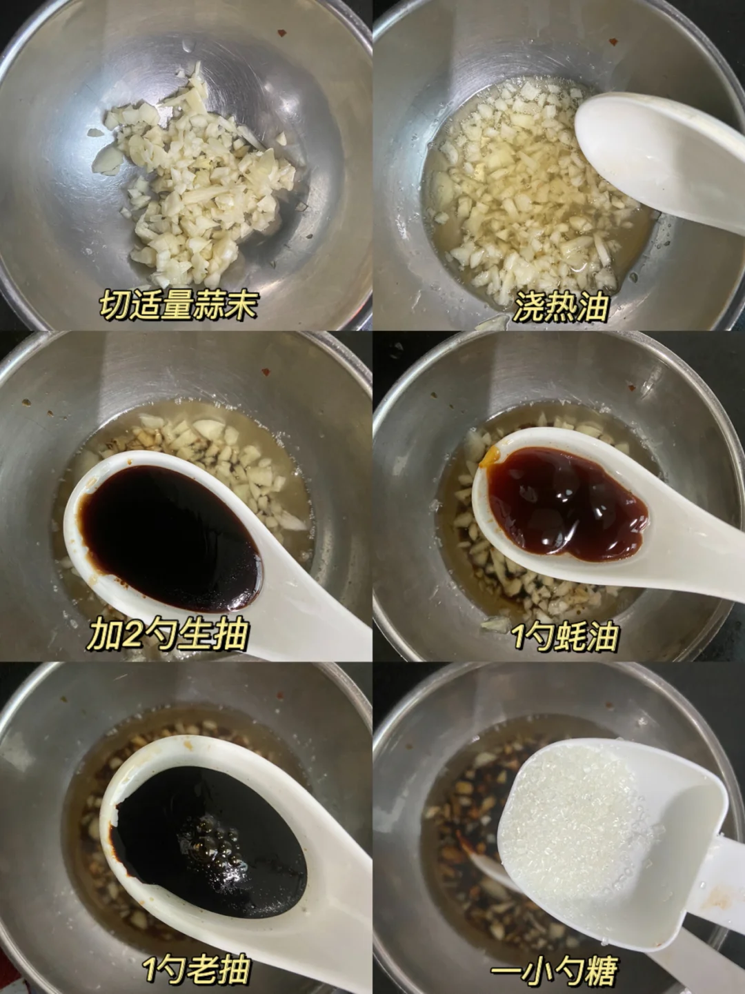 3️⃣切一头蒜末 浇上热油 +2勺生抽+1勺蚝油+1勺老抽+1小勺糖+1小勺盐+1小勺白胡椒粉 搅拌均匀备用