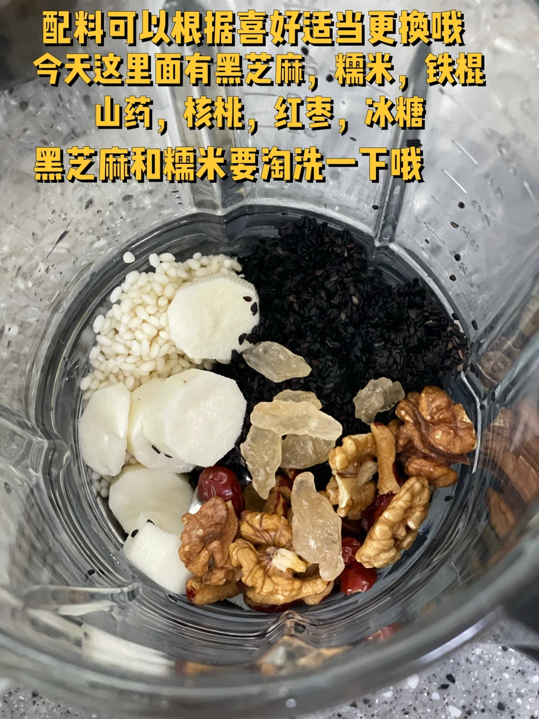 1. 配料可以根据喜好适当更换哦,今天这里面有黑芝麻60g,糯米20g,铁棍山药,核桃,红枣,冰糖适量(后面的量不需要太绝对)