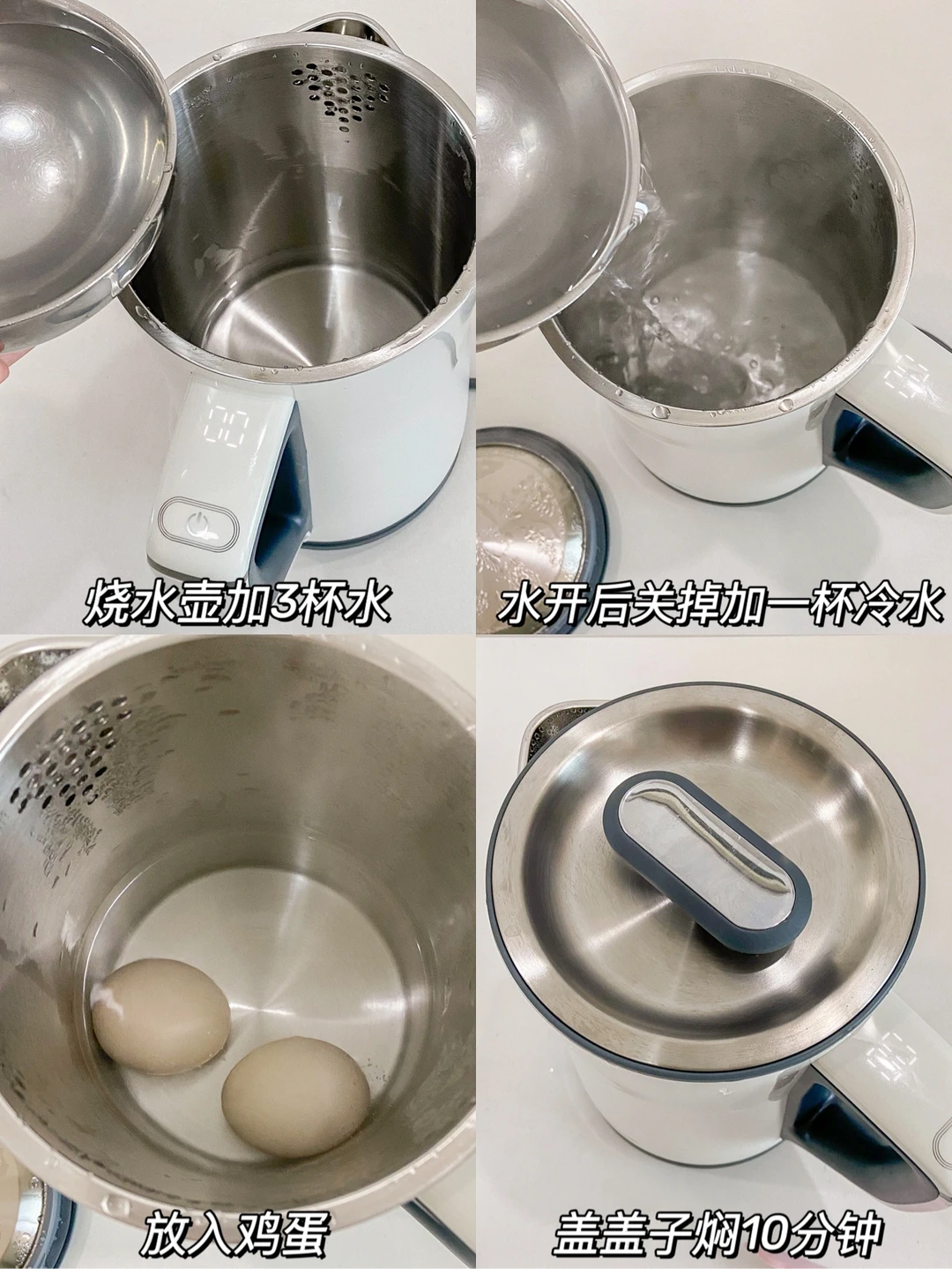 1️⃣烧水壶加3杯水 水开后关掉加一杯冷水放入鸡蛋 盖上盖子焖10分钟