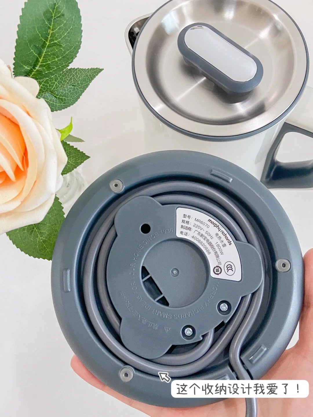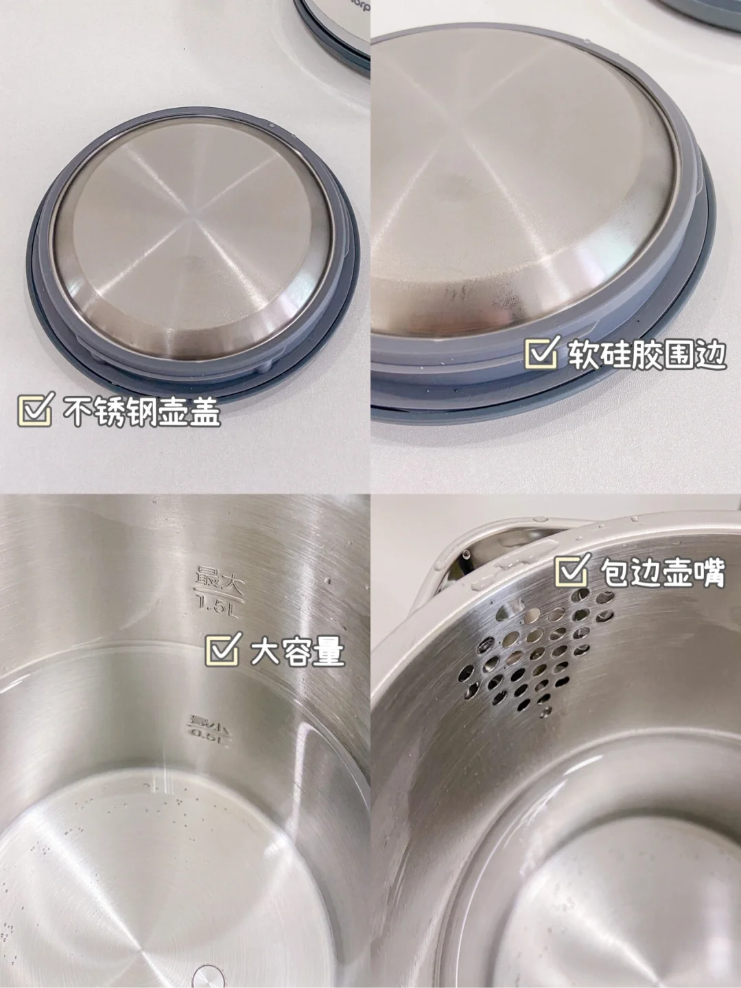 内胆和壶盖都采用不锈钢食品级304 用起来安全也放心 壶身材质是双层加厚的 不怕烫手 独立的壶盖更好清洗 线的收纳设计也狠特别❤