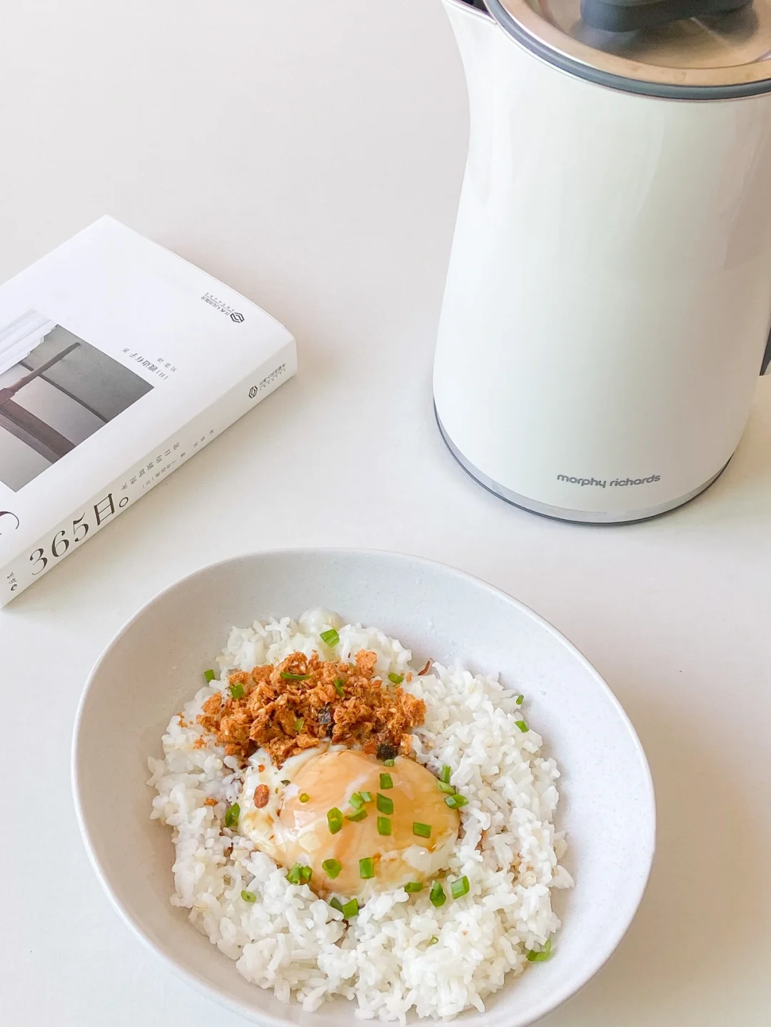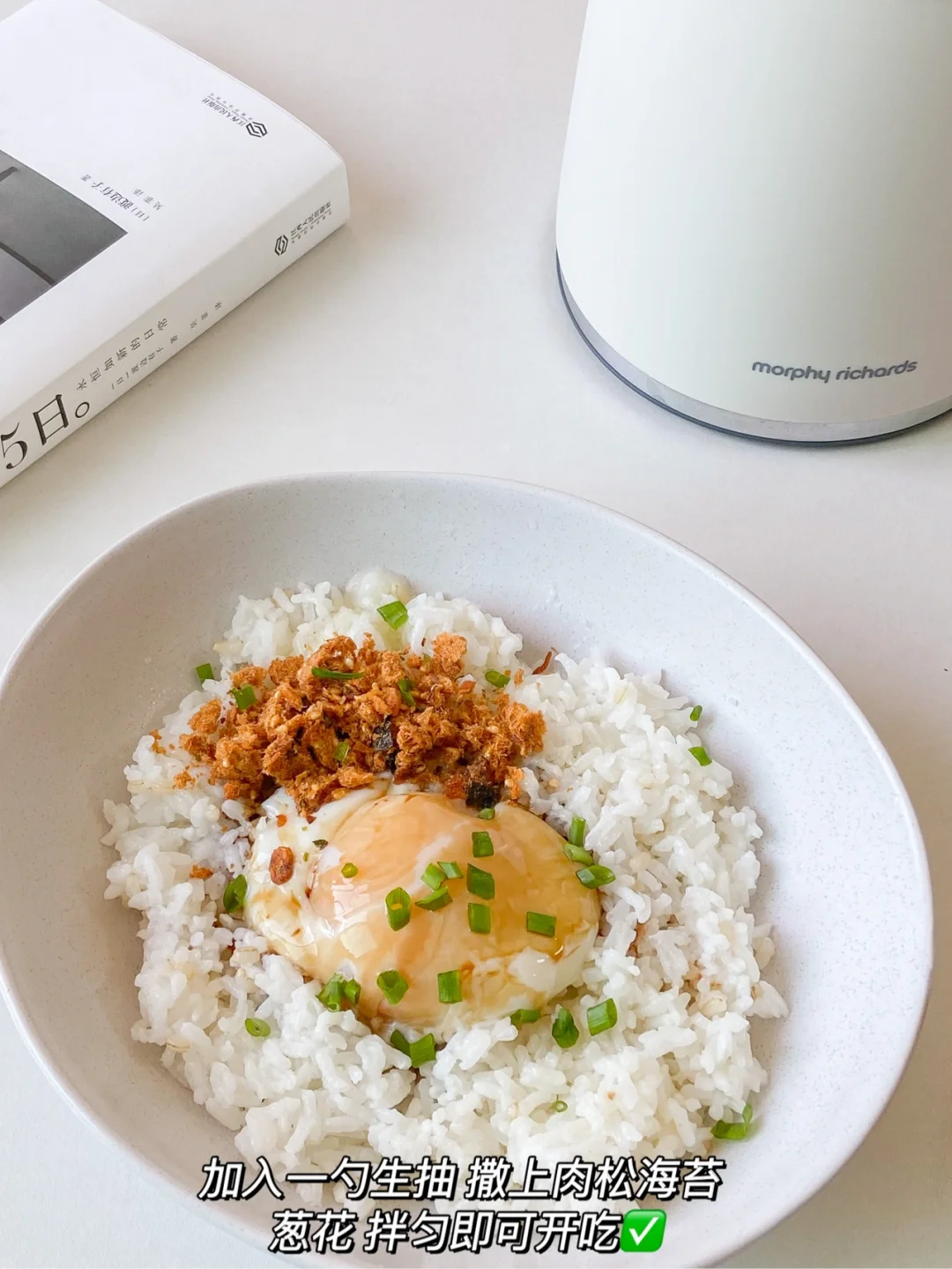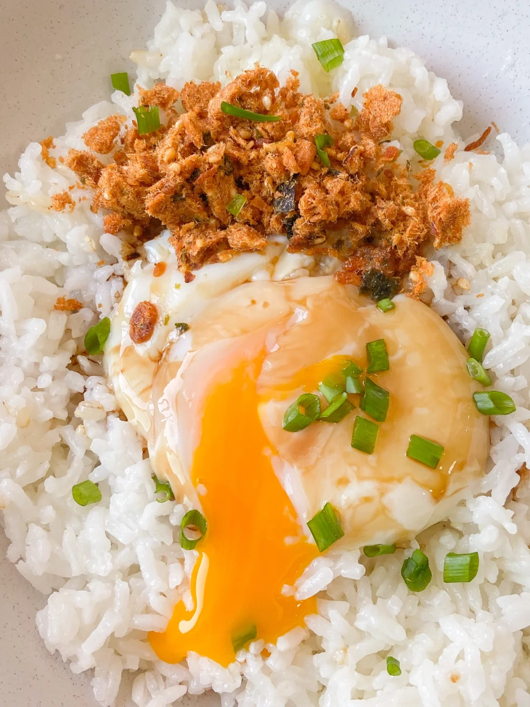 3️⃣碗中盛入米饭 打入温泉蛋 加入一勺生抽 撒上肉松海苔 葱花 拌匀即可开吃✅