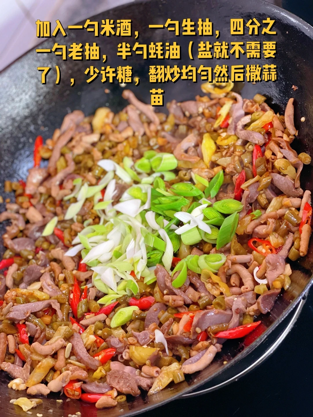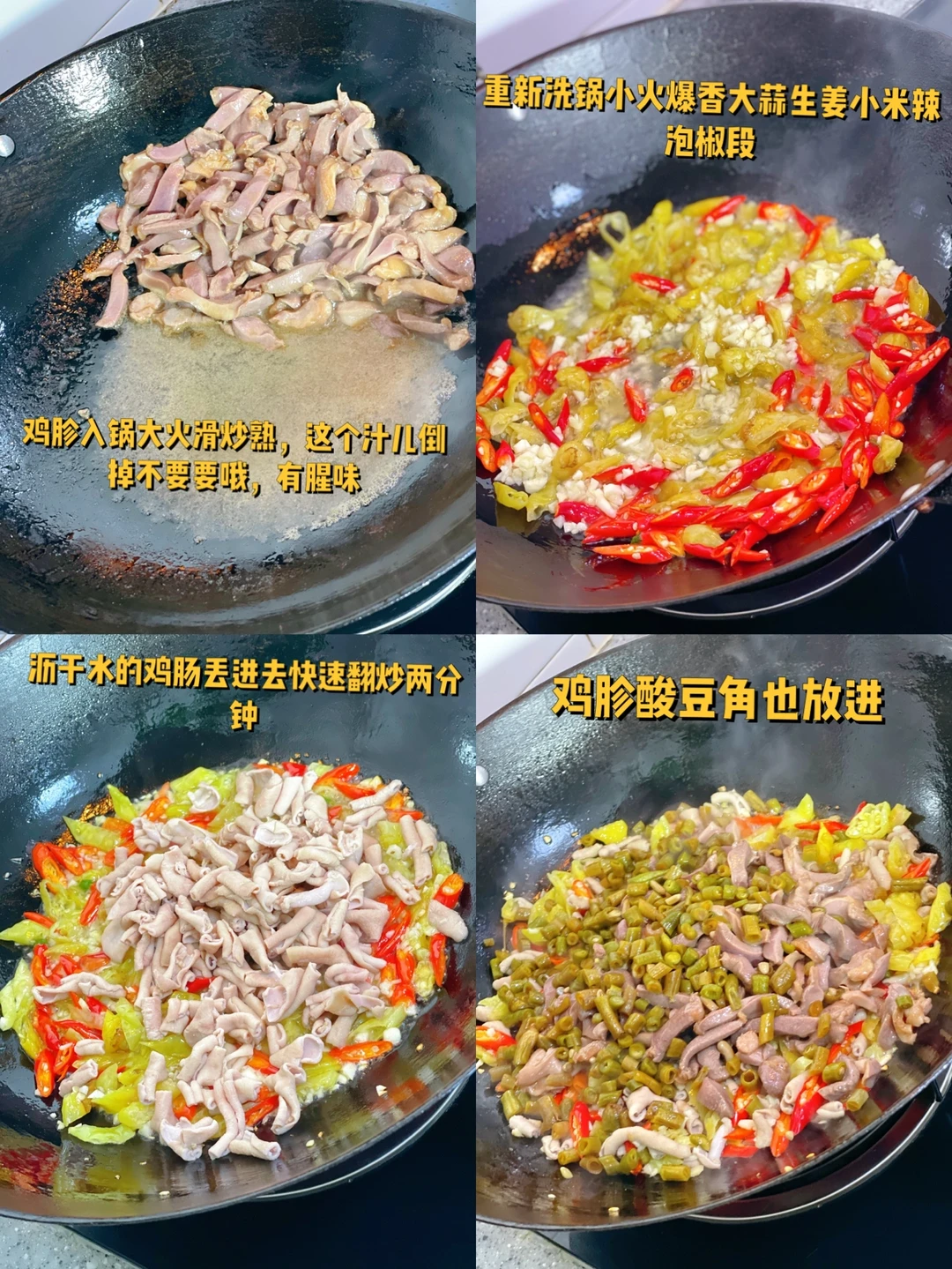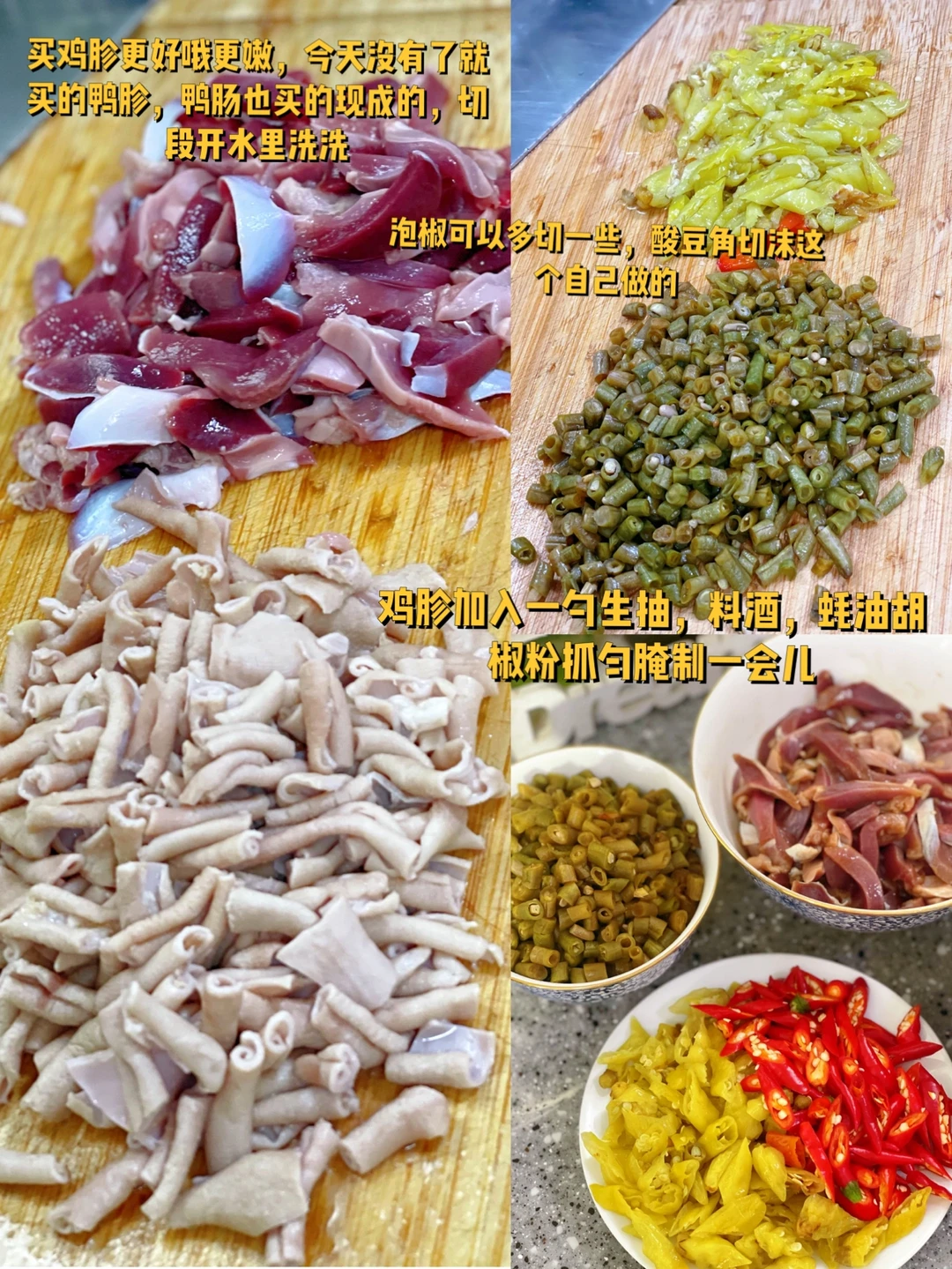 1. 买鸡胗更好哦更嫩,今天没有了就买的鸭胗,鸭肠也买的现成的,切段开水里洗洗 2. 泡椒可以多切一些,酸豆角切沫这个自己做的 3. 鸡胗加入一勺生抽,料酒,蚝油胡椒粉抓匀腌制一会儿 4. 鸡胗酸豆角也放进 5. 加入一勺米酒,一勺生抽,四分之一勺老抽,半勺蚝油(盐就不需要了),少许糖,翻炒均匀然后撒蒜苗 6. 最后放一丢丢鸡粉就可以出锅啦,时间不要久鸭胗容易老哦
