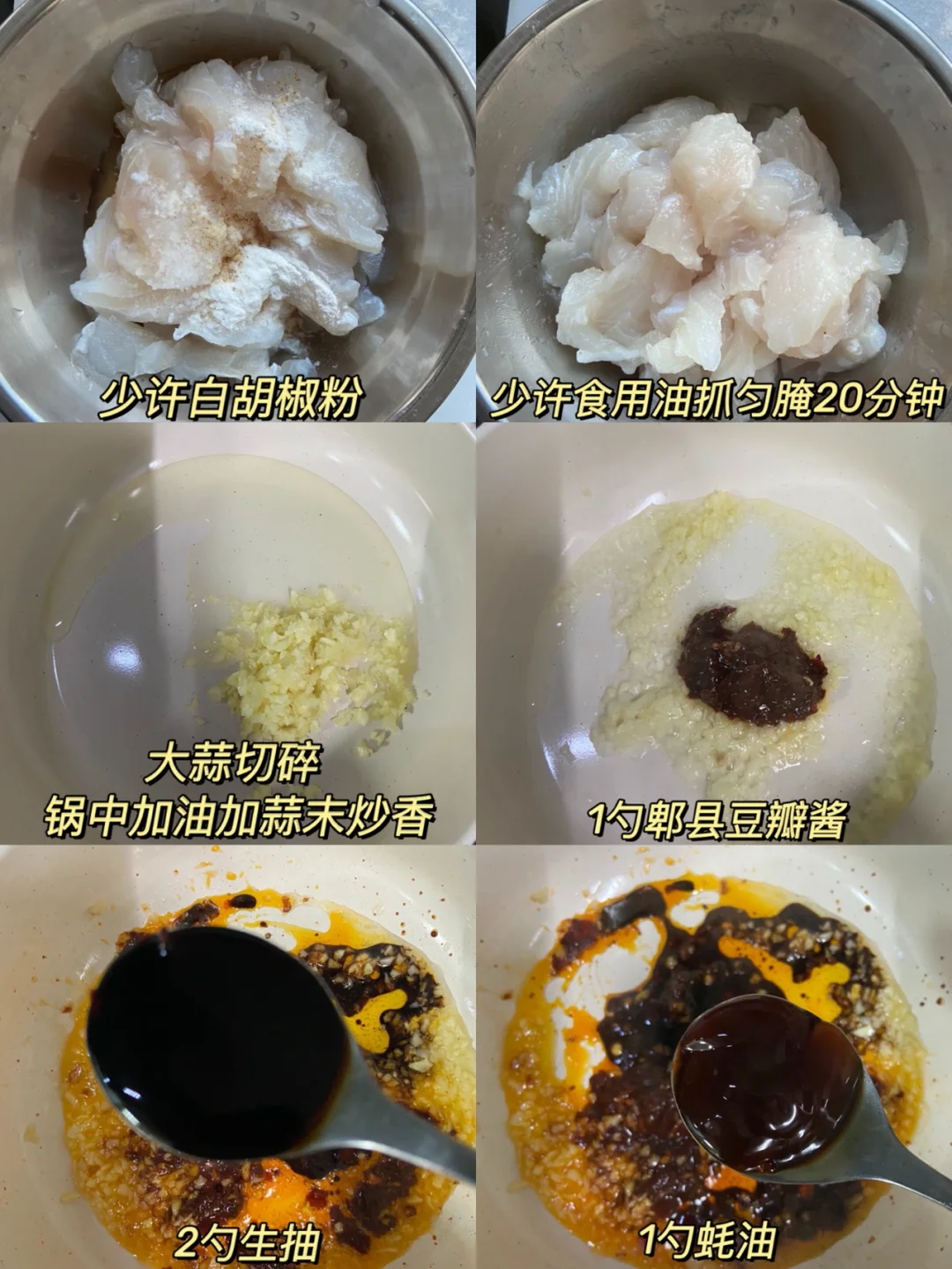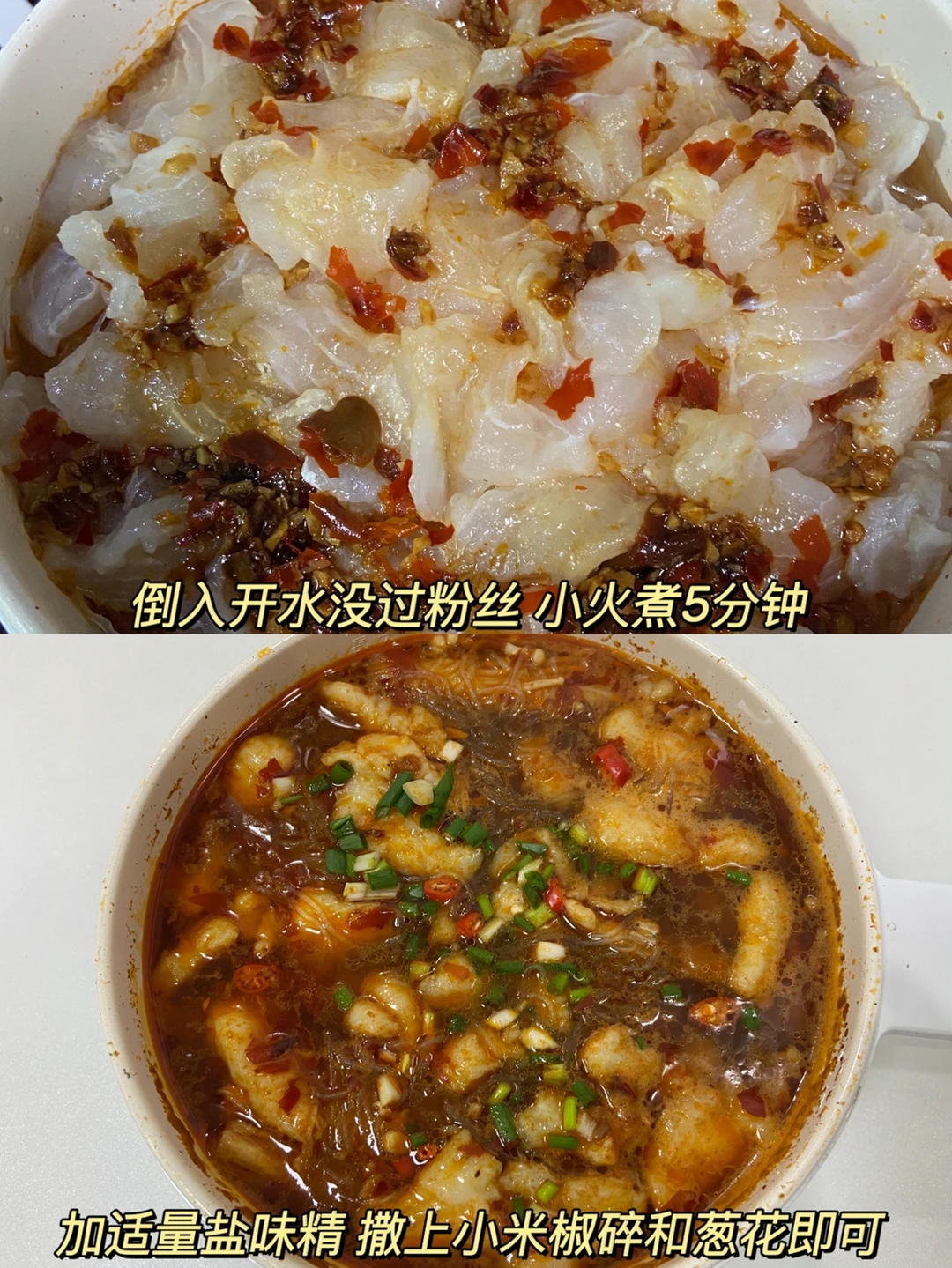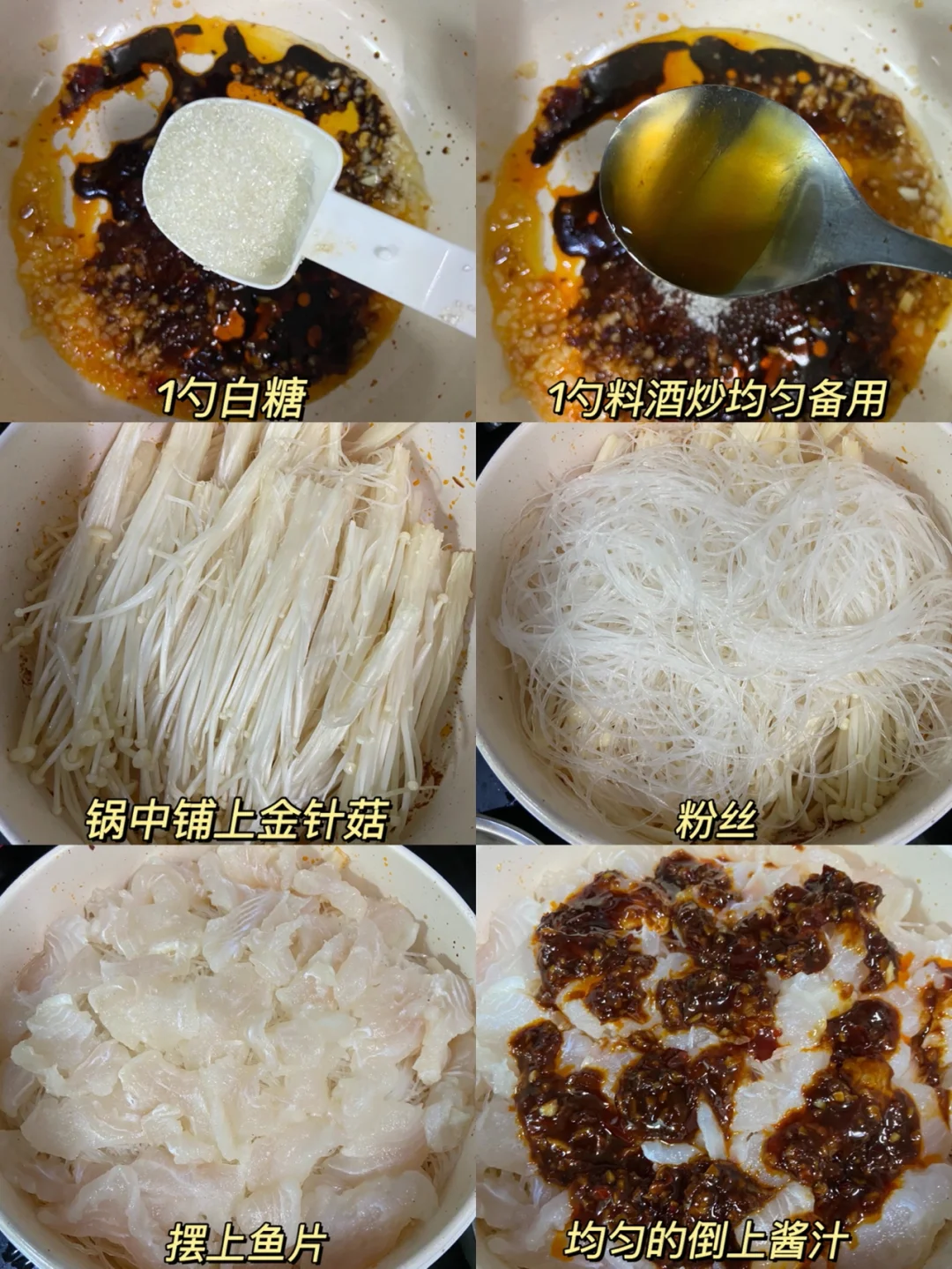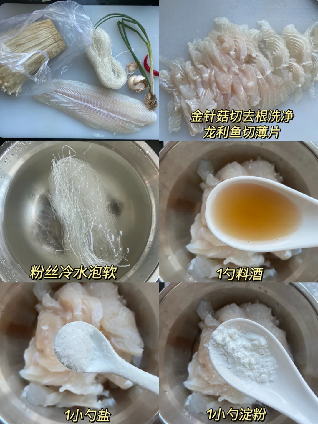 准备食材✨✨✨✨✨ 巴沙鱼一条 金针菇半个 粉丝一捆 小米椒1条 大蒜5.6颗 葱花 做法✨✨✨✨✨ 1️⃣粉丝冷水泡软 金针菇切去根洗净 龙利鱼切薄片 2️⃣鱼肉➕1勺料酒➕1小勺盐➕1小勺淀粉➕少许白胡椒粉➕少许食用油抓匀腌20分钟 3️⃣大蒜切碎 锅中加油加蒜末炒香➕1勺郫县豆瓣酱➕2勺生抽➕1勺蚝油➕1勺白糖➕1勺料酒炒均匀备用 4️⃣锅中铺上金针菇 粉丝 摆上鱼片 均匀的倒上酱汁 倒入开水没过粉丝 小火煮5分钟 根据自己的口味加盐味精 撒上小米椒碎和葱花即可