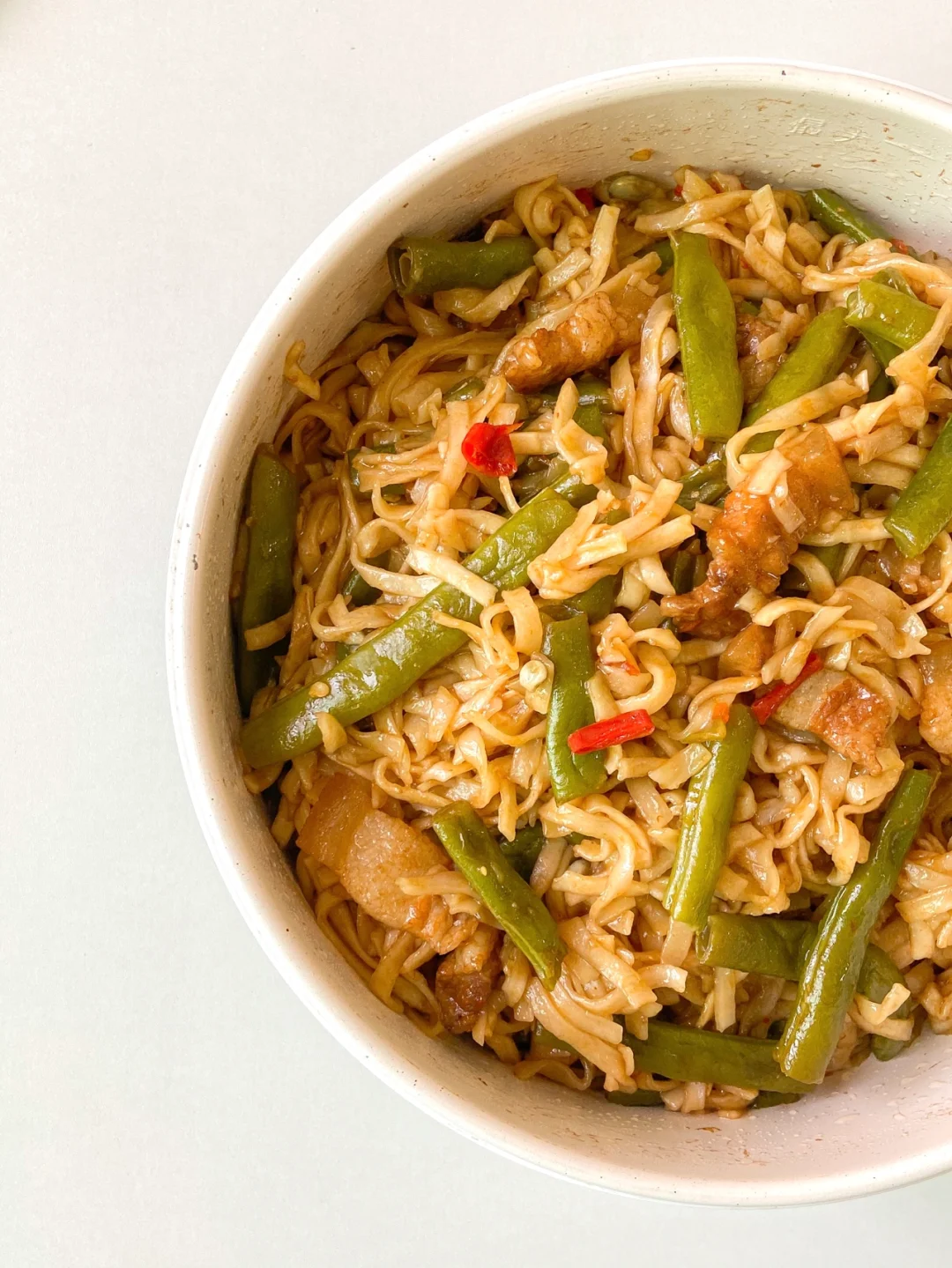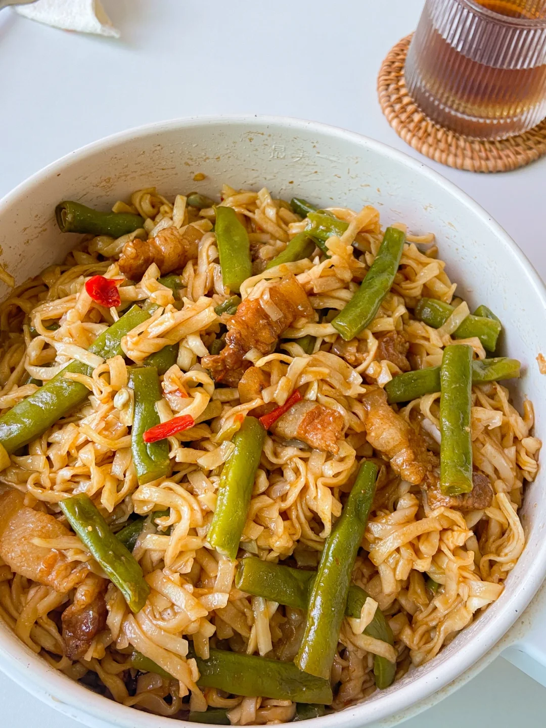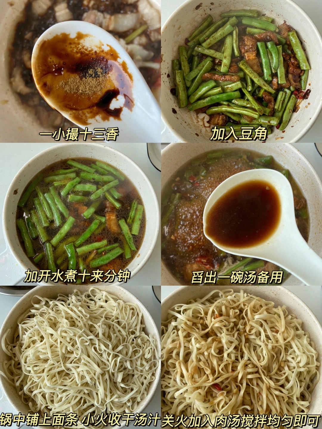 面食主义者不能错过的豆角焖面👍🏻简单又好吃 准备食材✨✨✨✨✨ 豆角 鸡蛋面 五花肉 小米辣 葱姜蒜 十三香 做法✨✨✨✨✨ 1️⃣豆角切段 五花肉切片 葱切段姜切丝大蒜切碎 小米椒切碎备用 2️⃣热油加葱姜蒜 辣椒炒香 放入五花肉炒变色 3️⃣一勺料酒➕一勺生抽➕一勺老抽➕一勺蚝油➕一小勺盐➕一小撮十三香 加入豆角 4️⃣加开水煮十来分钟 舀出一碗汤备用 锅中铺上面条 小火收干汤汁 5️⃣关火加入肉汤搅拌均匀即可