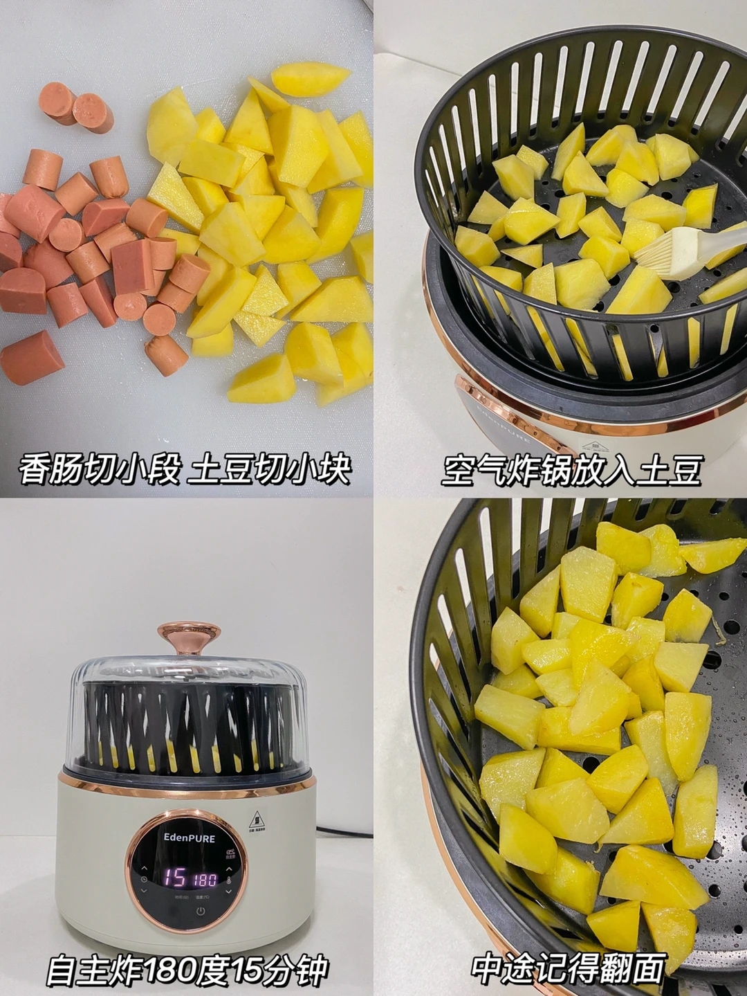 一直很喜欢路边摊的烤土豆 但是路边摊总是没那么干净 今天自己用空气炸锅做了烤土豆还加了香肠 简单健康又好吃!