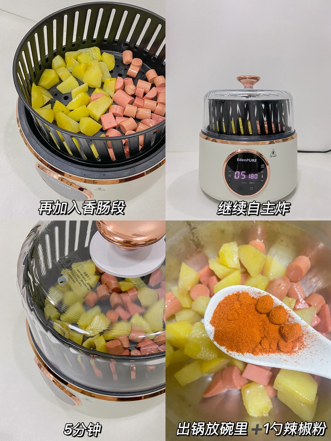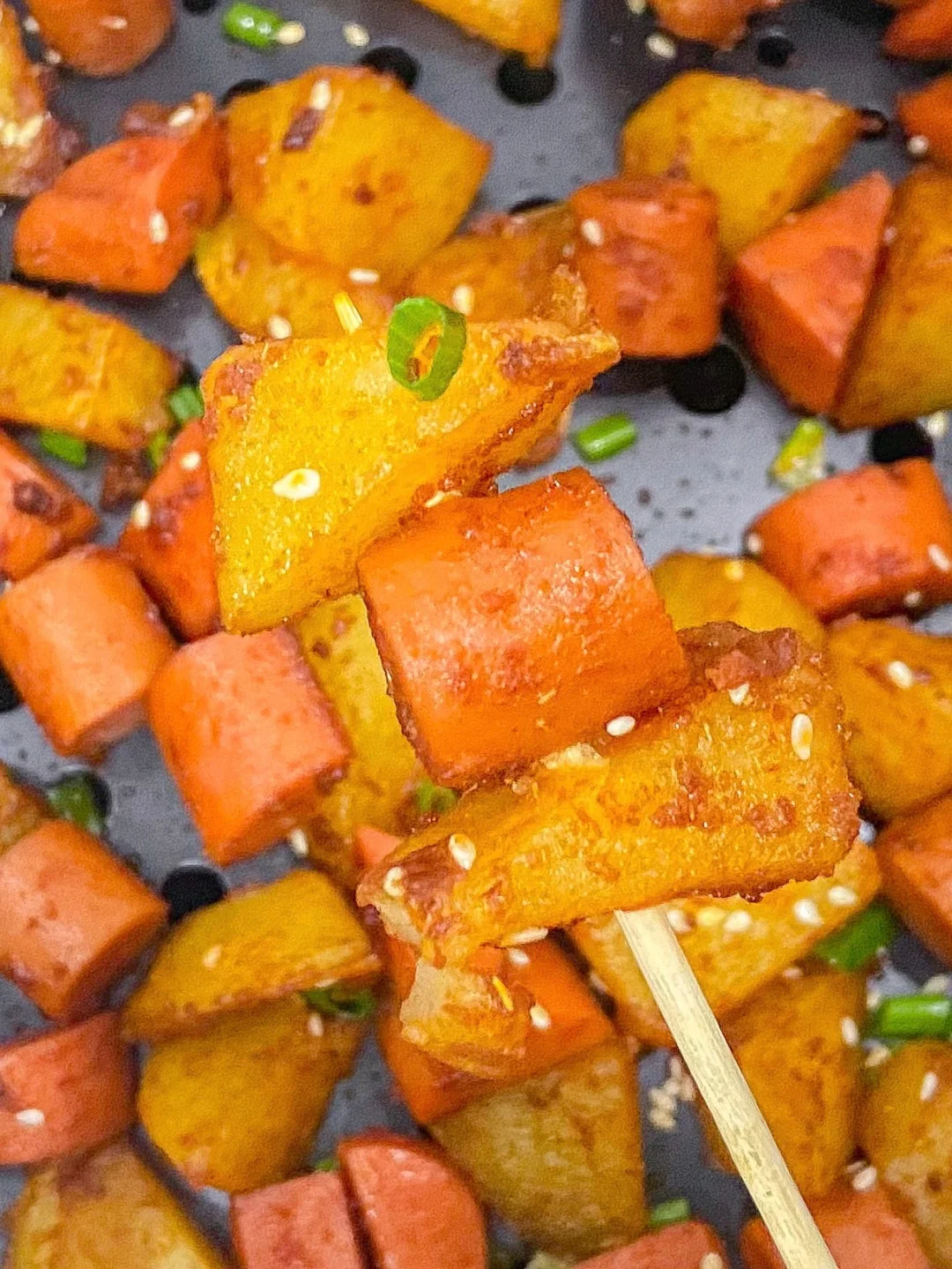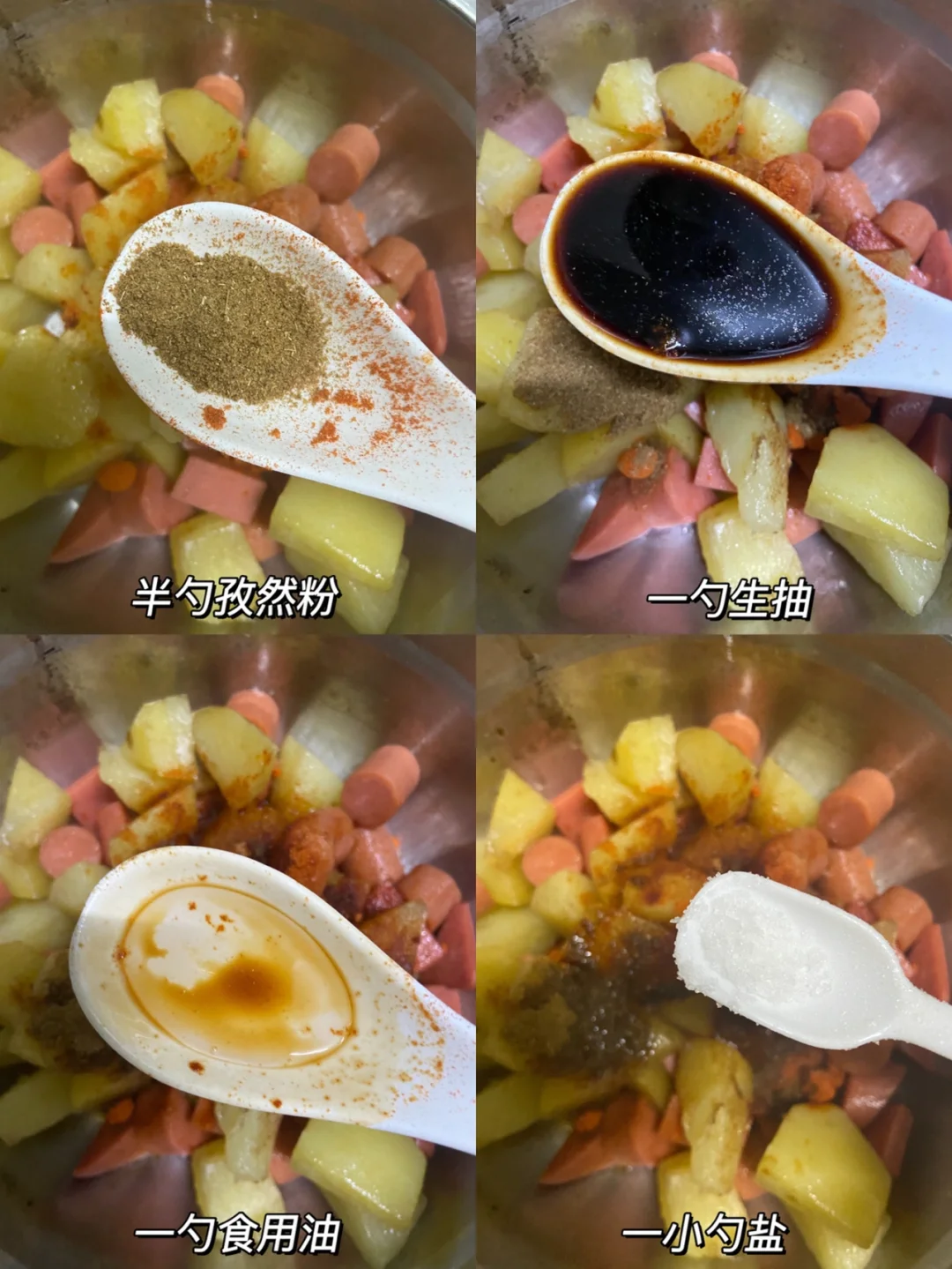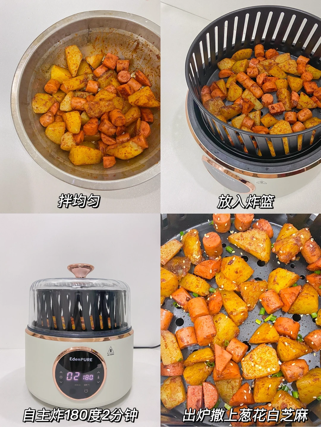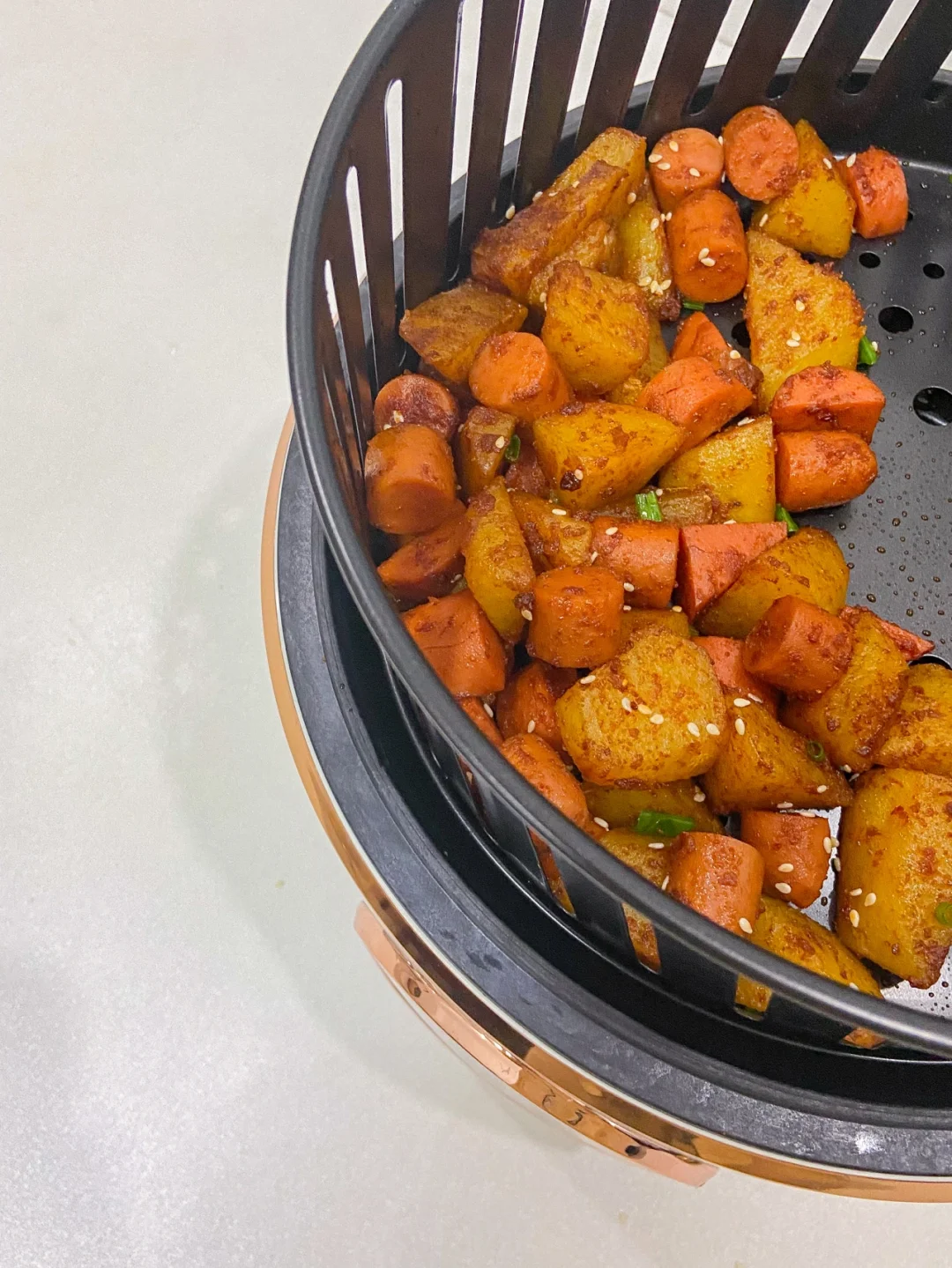 3️⃣再加入香肠段烤5分钟 出锅放碗里➕1勺辣椒粉➕半勺孜然粉➕1勺生抽➕一勺食用油➕一小勺盐再放空气炸锅烤2分钟出锅撒上熟芝麻葱花更好吃!