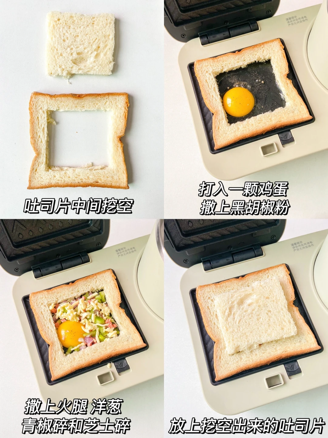 3️⃣放上挖空出来的吐司片 合上机器盖子3分钟即可
