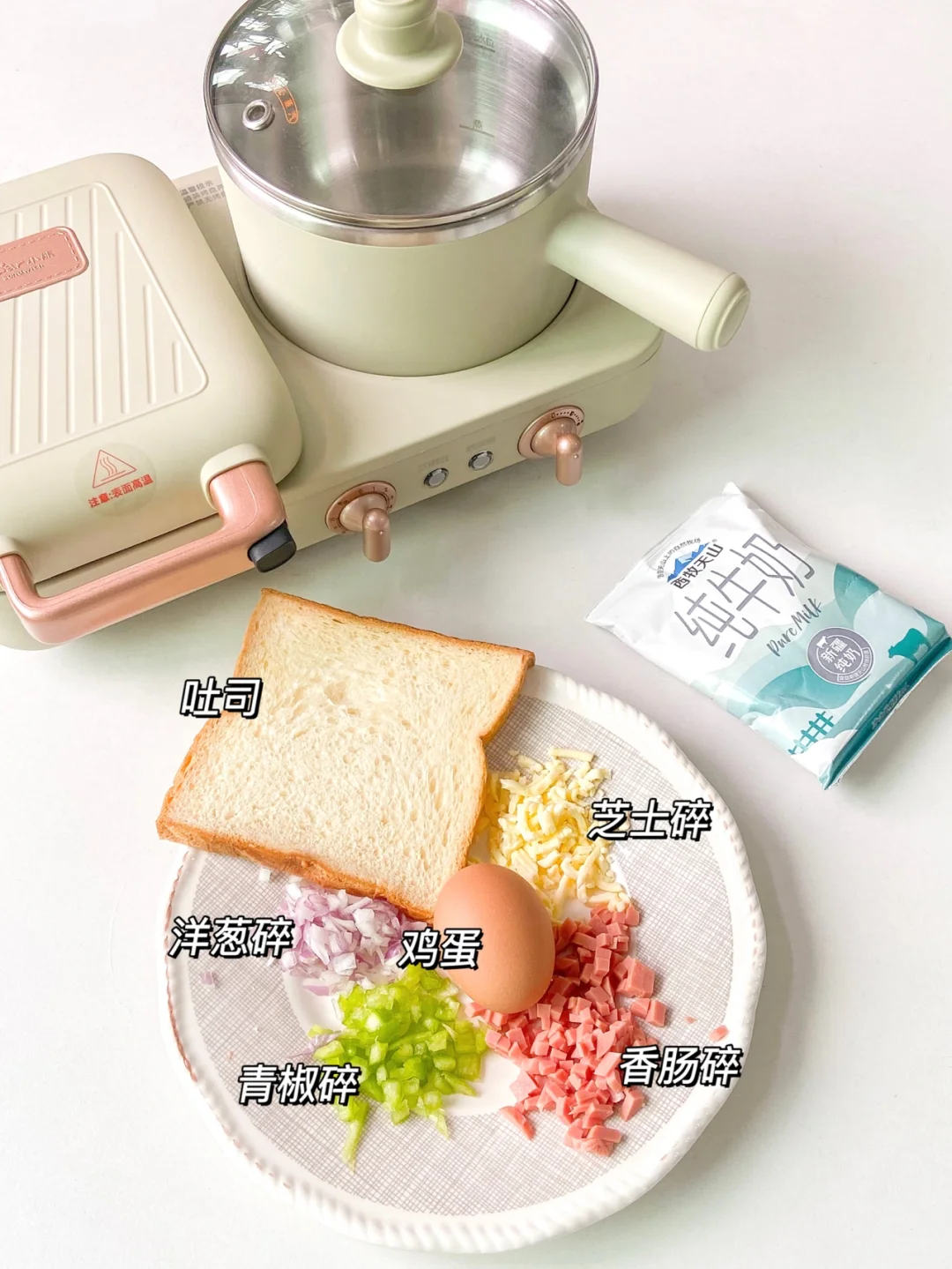 吐司一片 芝士碎 火腿碎 洋葱碎 青椒碎 鸡蛋