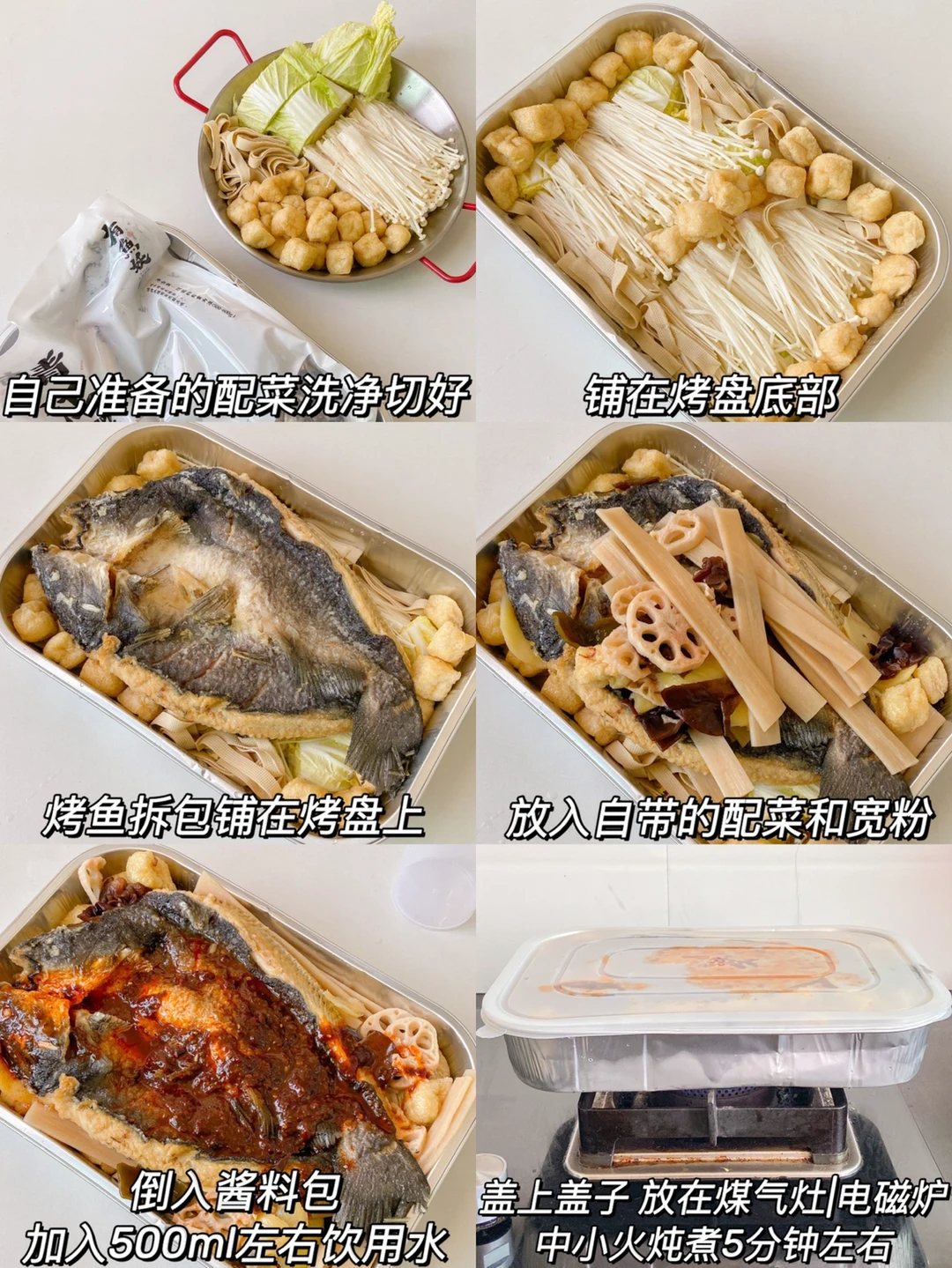 2️⃣烤鱼拆包铺在烤盘上 放入自带的配菜和宽粉 倒入酱料包 加入500ml左右饮用水