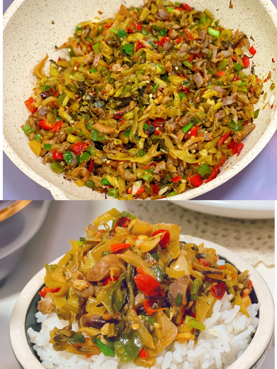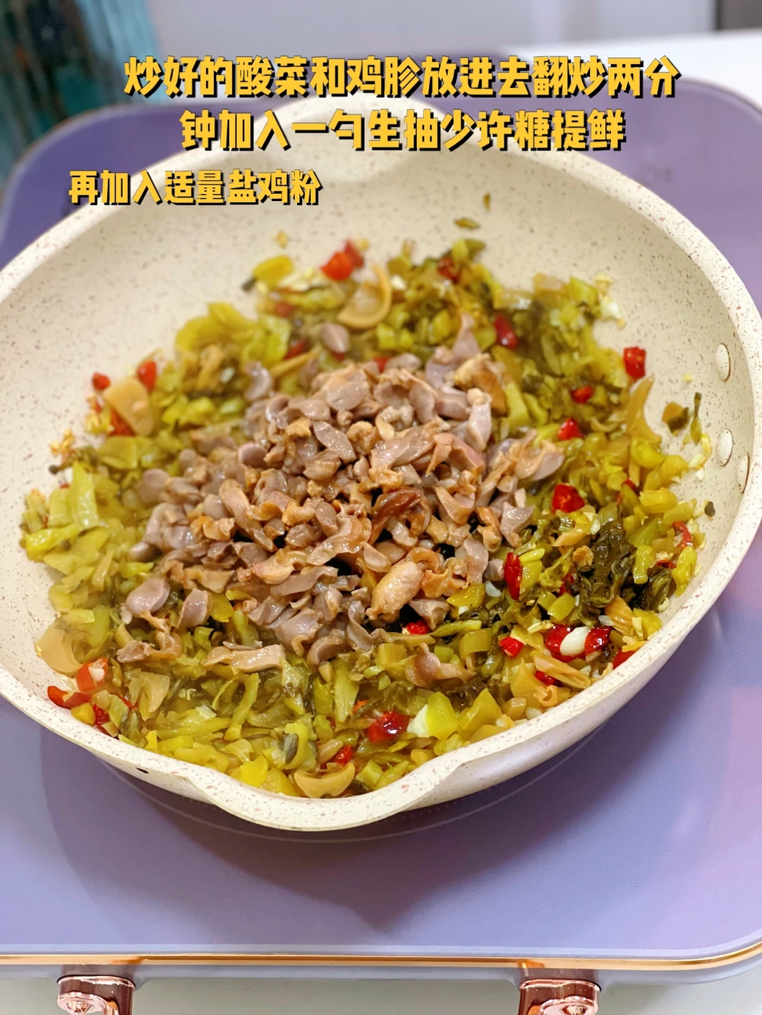 7. 炒好的酸菜和鸡胗放进去翻炒两分钟加入一勺生抽少许糖提鲜,再加入适量盐鸡粉