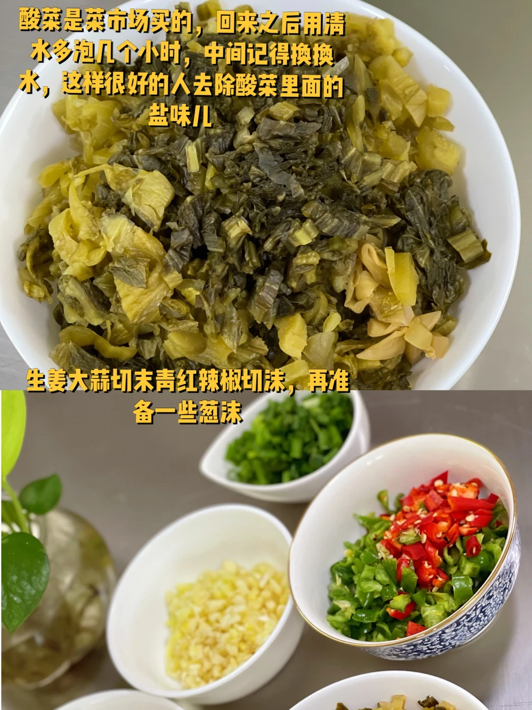 2. 酸菜是菜市场买的,回来之后用清水多泡几个小时,中间记得换换水,这样很好的去除酸菜里面的盐味儿