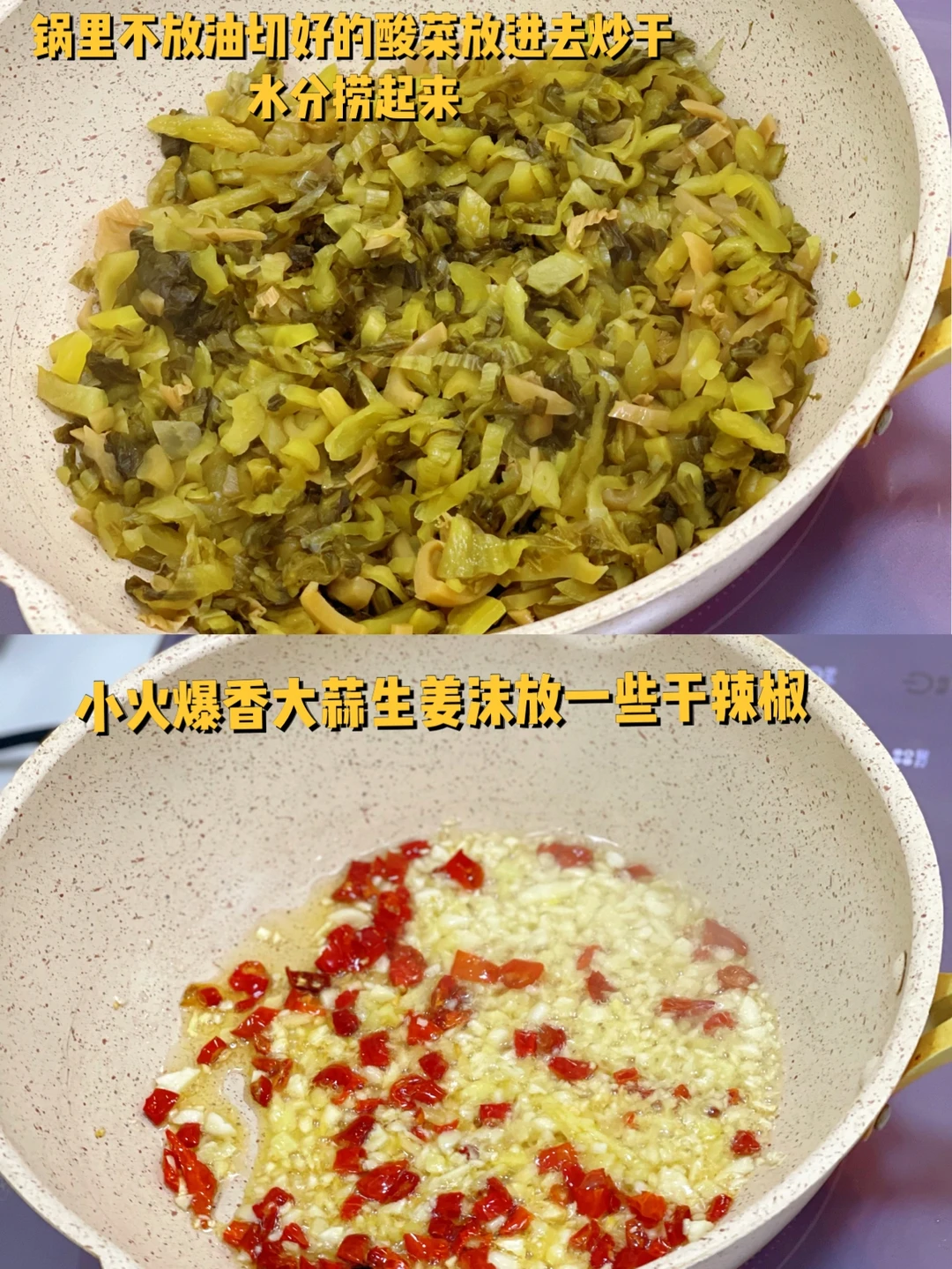 5. 锅里不放油切好的酸菜放进去炒干水分捞起来