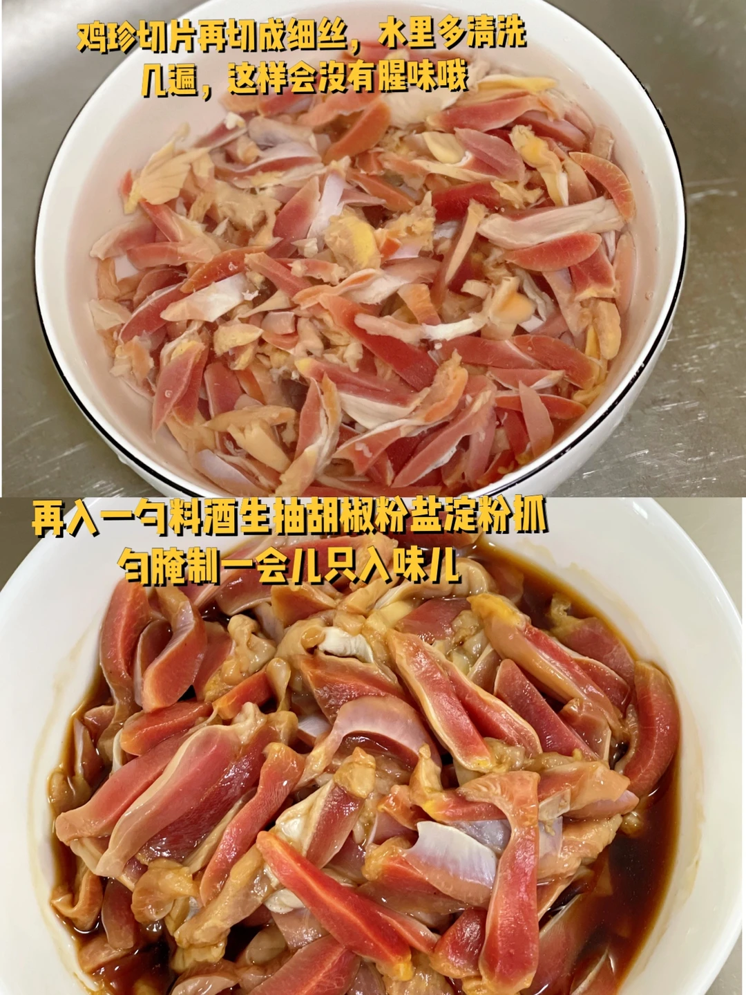 1. 鸡珍切片再切成细丝,水里多清洗几遍,这样会没有腥味哦