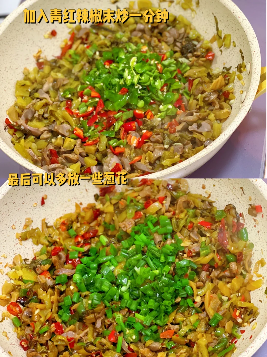 9. 加入青红辣椒末炒一分钟,最后可以多放一些葱花