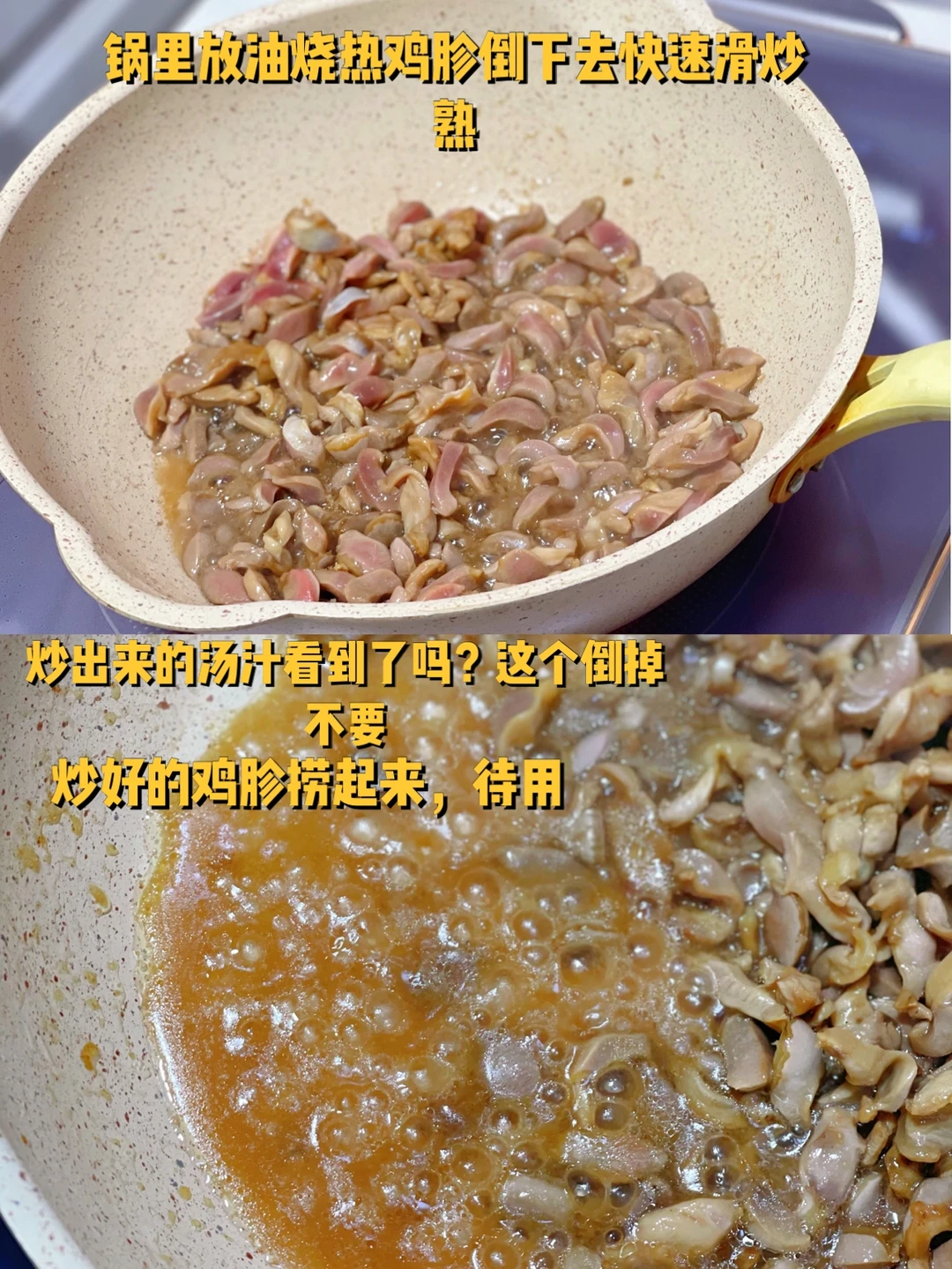 3. 锅里放油烧热鸡胗倒下去快速滑炒熟