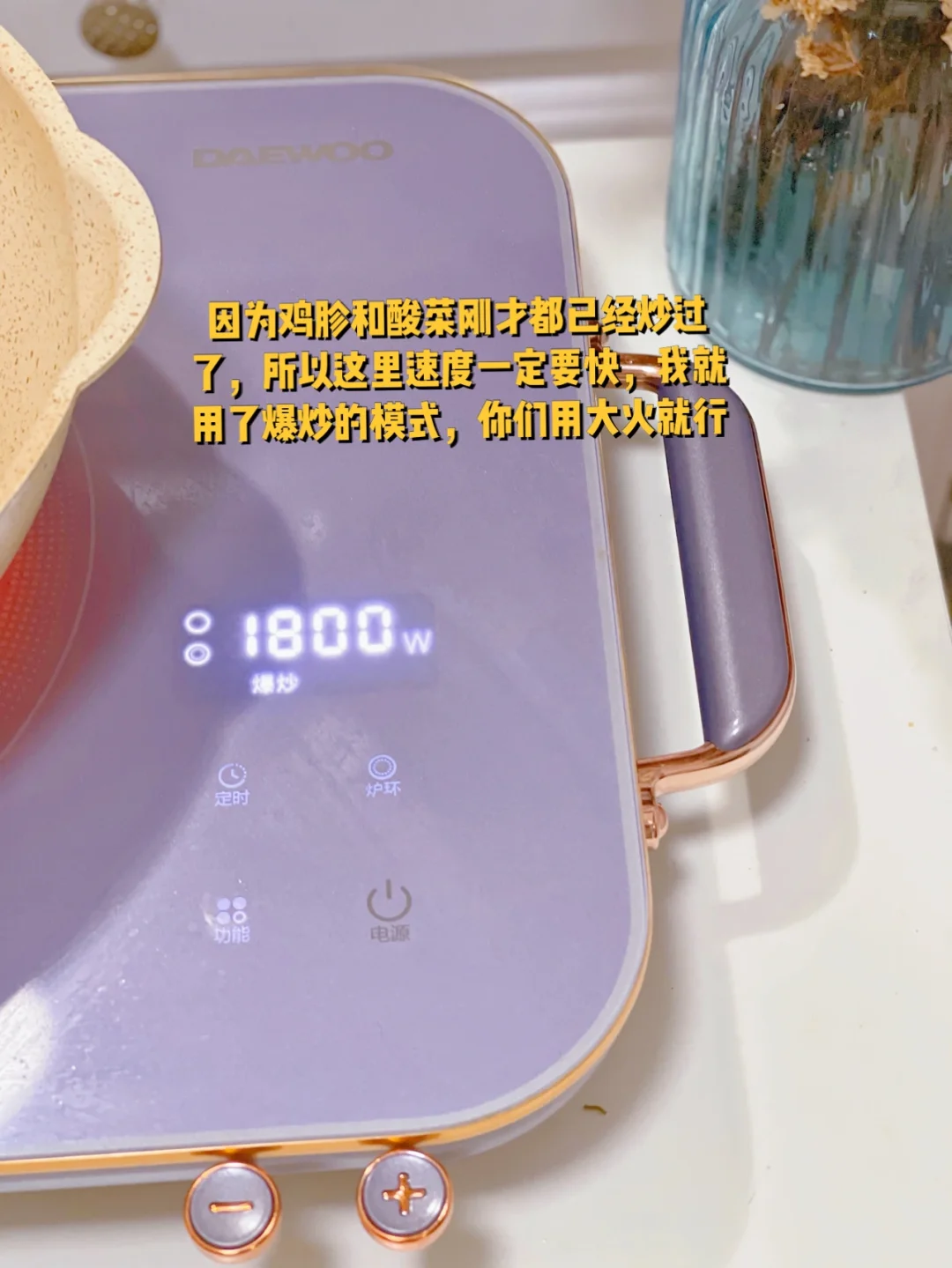 8.因为鸡胗和酸菜刚才都已经炒过了,所以这里速度一定要快,我就用了电陶炉爆炒的模式,你们用大火就行