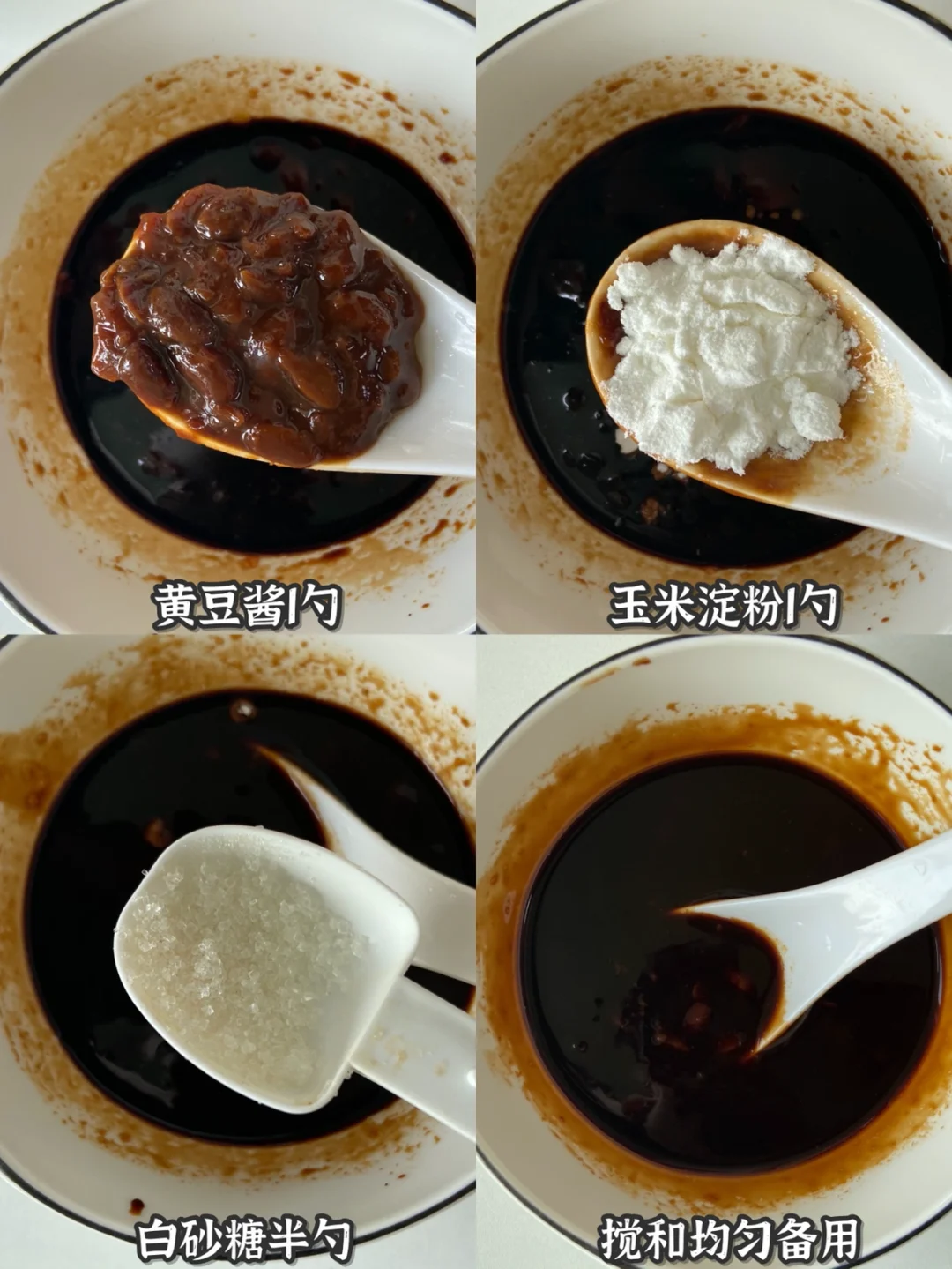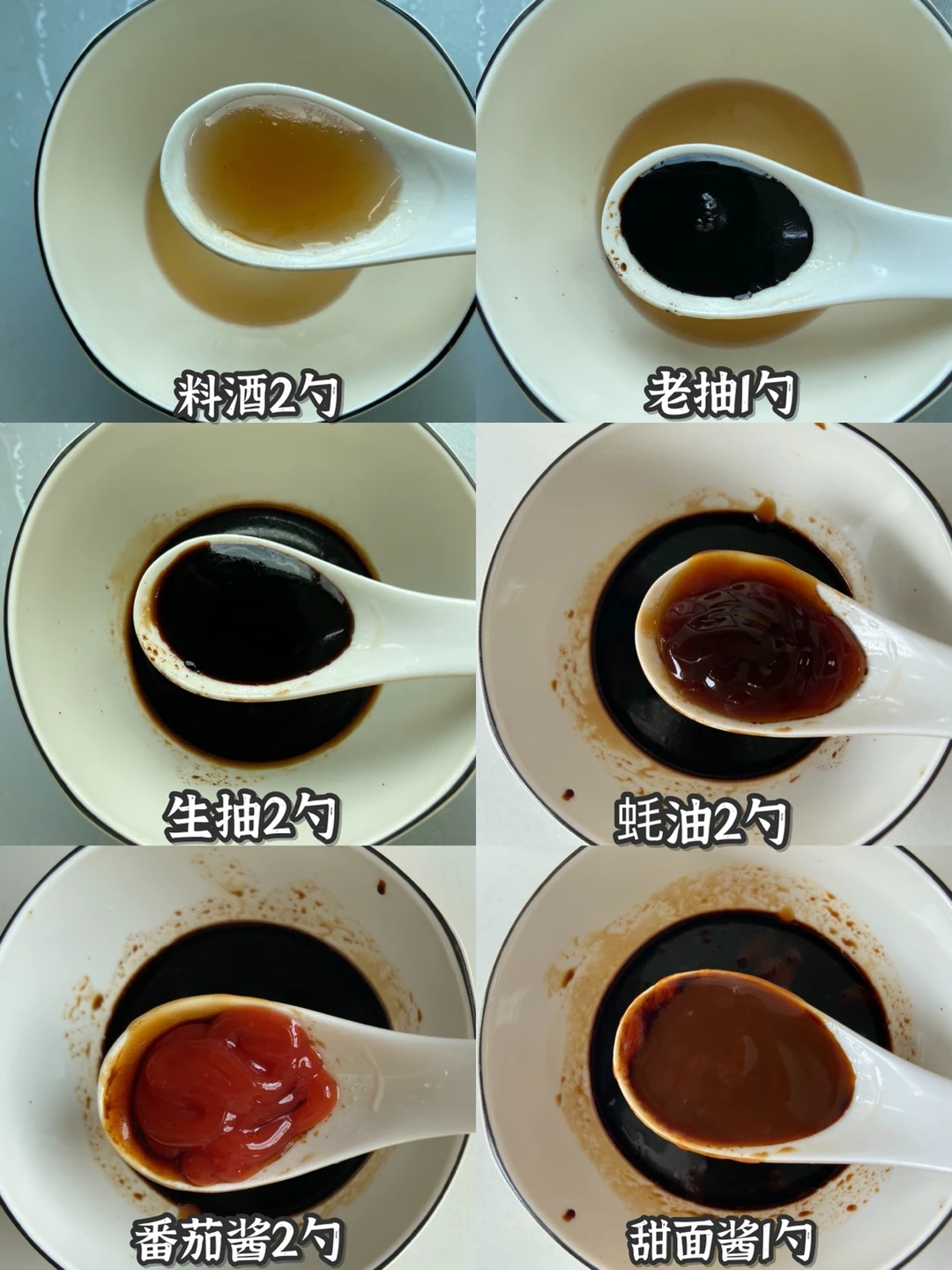 4️⃣ 先调个酱汁:料酒2勺➕老抽1勺➕生抽2勺➕蚝油2勺➕番茄酱2勺➕甜面酱1勺➕黄豆酱1勺➕玉米淀粉1勺➕白砂糖半勺