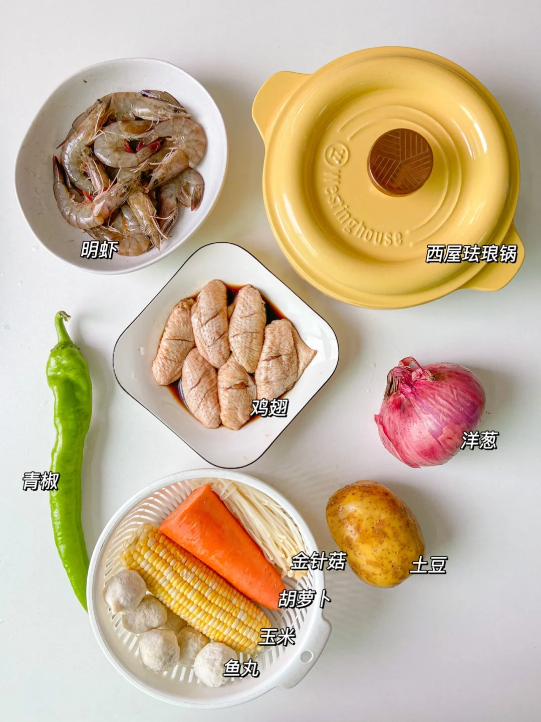 虾半斤 鸡中翅6个 鱼丸 土豆1个 胡萝卜1根 玉米1根 洋葱半个 青椒1根 金针菇半个 大蒜