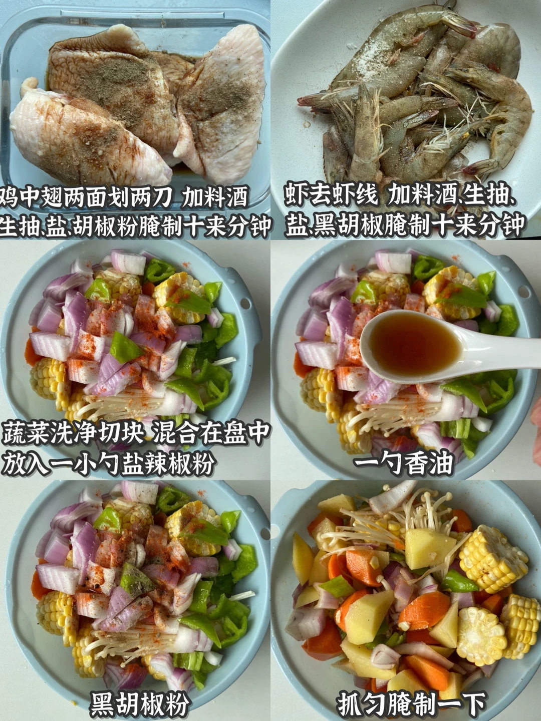 3️⃣蔬菜洗净切块 混合在盘中 放入一小勺盐辣椒粉 一勺香油 黑胡椒粉 抓匀腌制一下