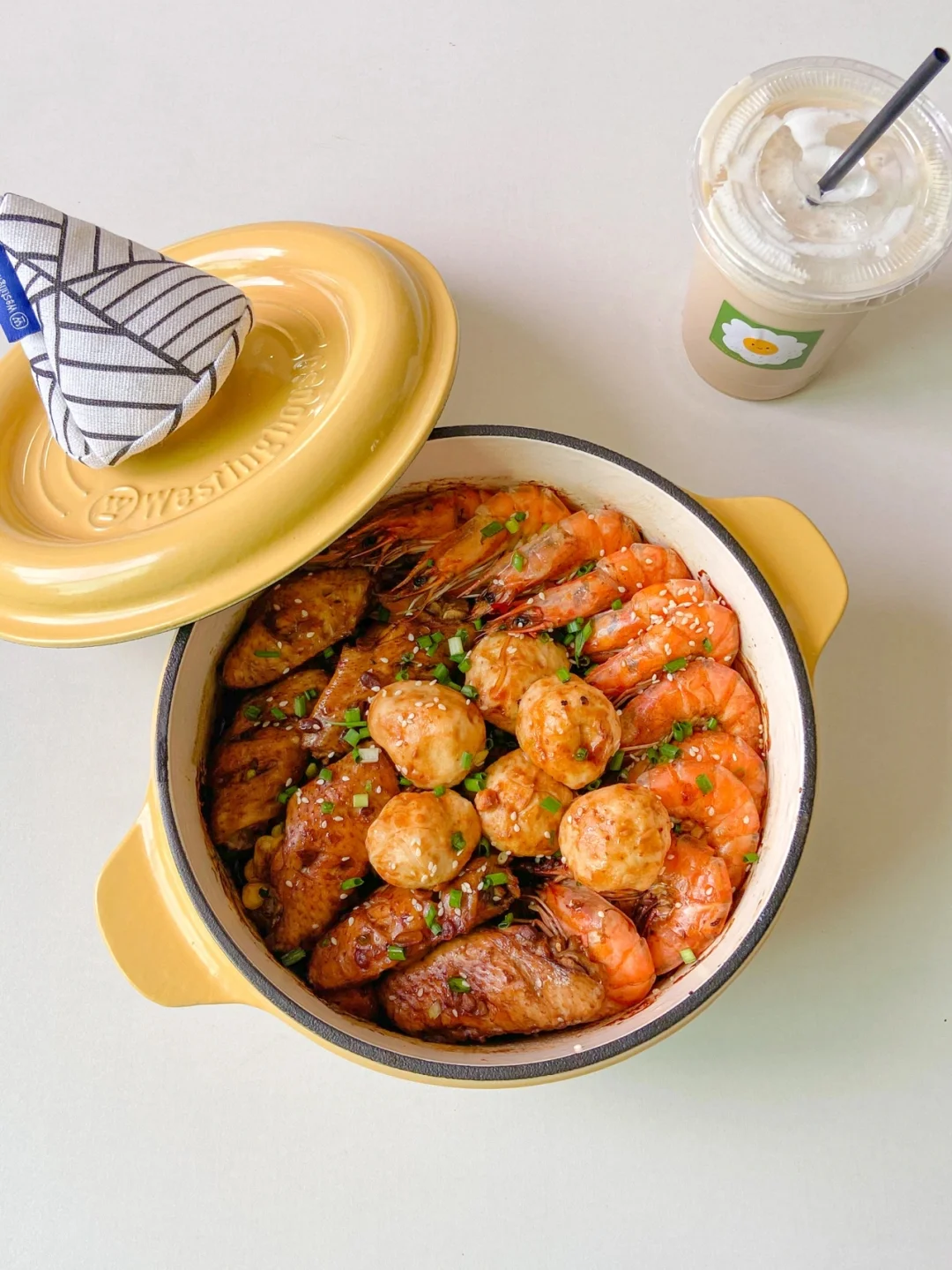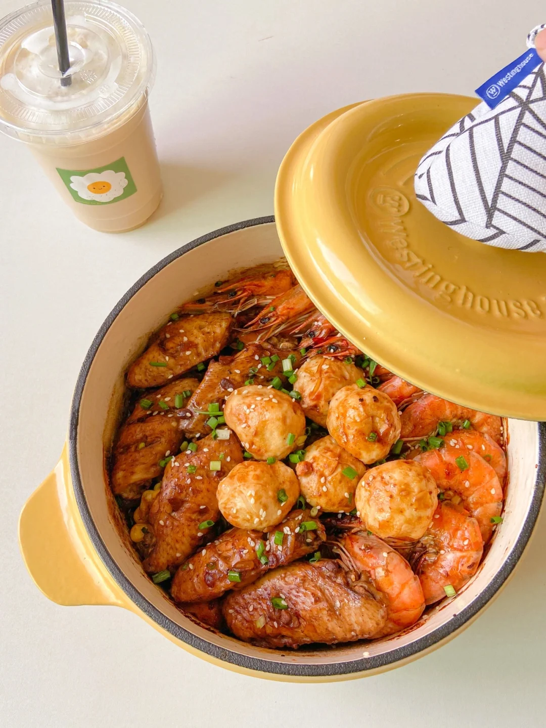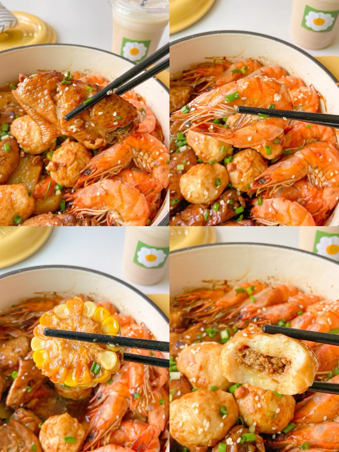 7️⃣摆上虾 丸子 倒入调好的酱汁 用刷子刷均匀 中小火焖10分钟 撒上白芝麻 葱花即可✔️