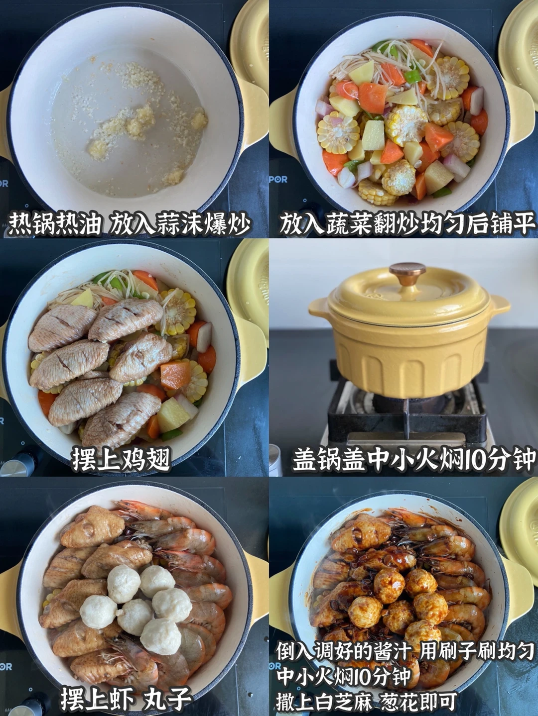 ⚠️记得用不粘锅 肉菜类会出水 要时刻观察水是否烧干 没水了就加点水 我用的锅是西屋铸铁珐琅焖焗锅22cm的 凝水设计微压锁水的特点水汽均匀回落自循环全程不用加水 白色珐琅内壁不粘锅 做岀来的菜味道很好!容量刚刚好 而且使用率高 可以焖炖焗煮 白珐琅还省去开锅的烦恼!而且这锅的颜值高 聚餐往桌上一摆真的太好看啦 ✌🏻