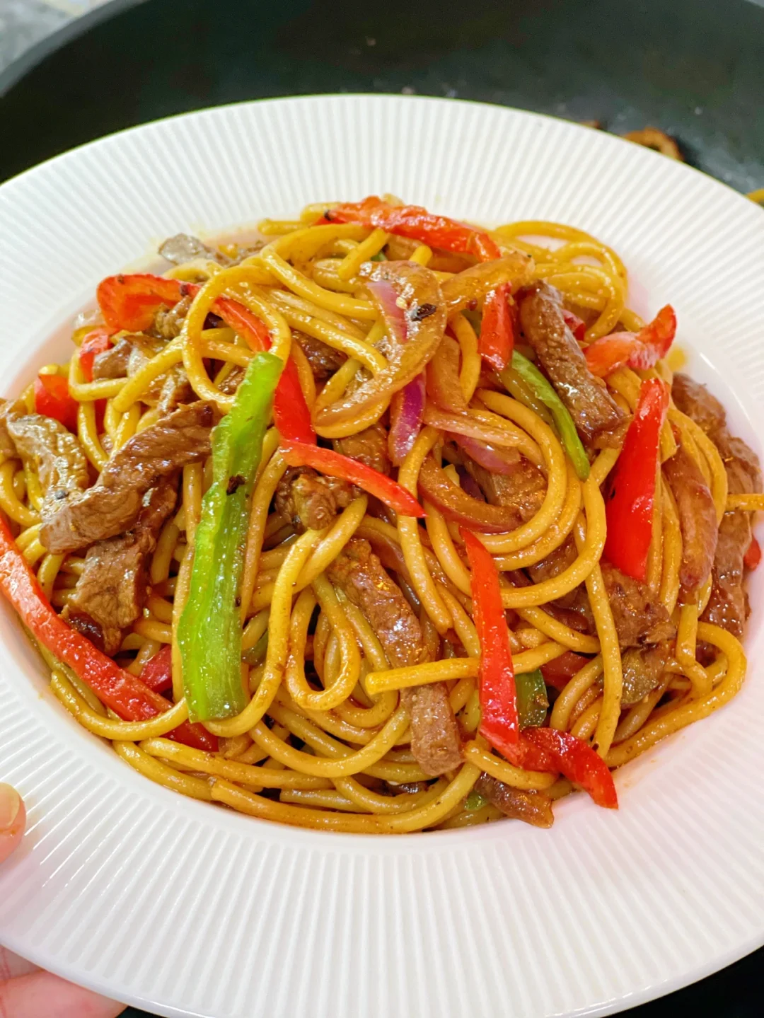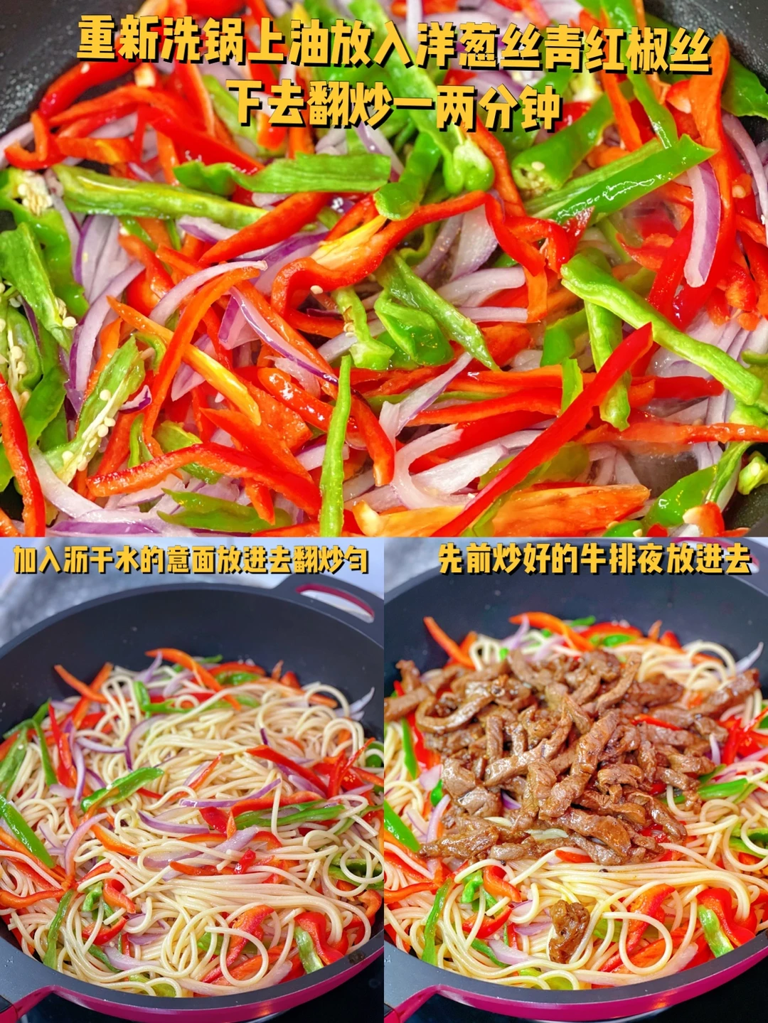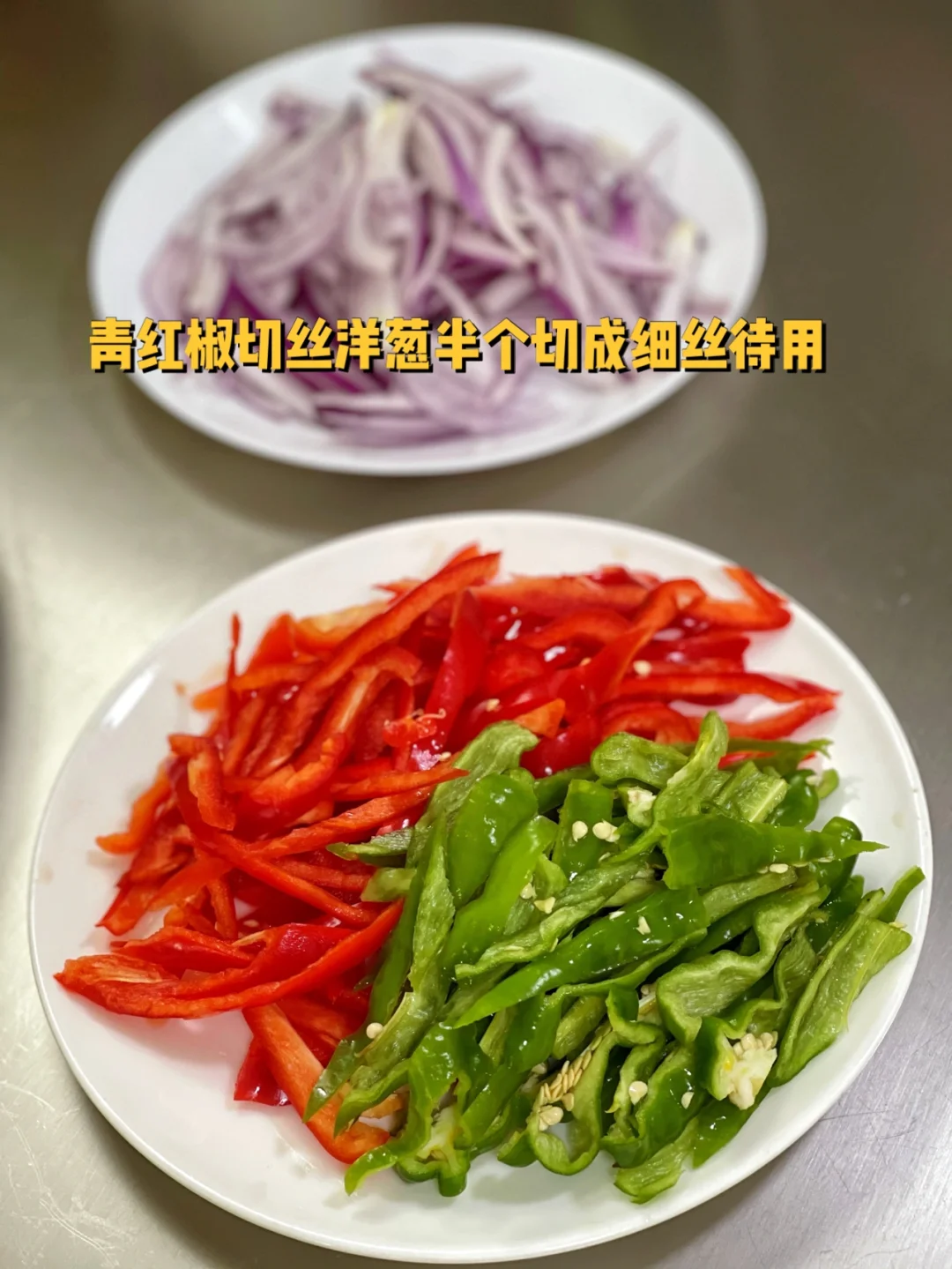 7. 重新洗锅上油放入洋葱丝青红椒丝下去翻炒一两分钟