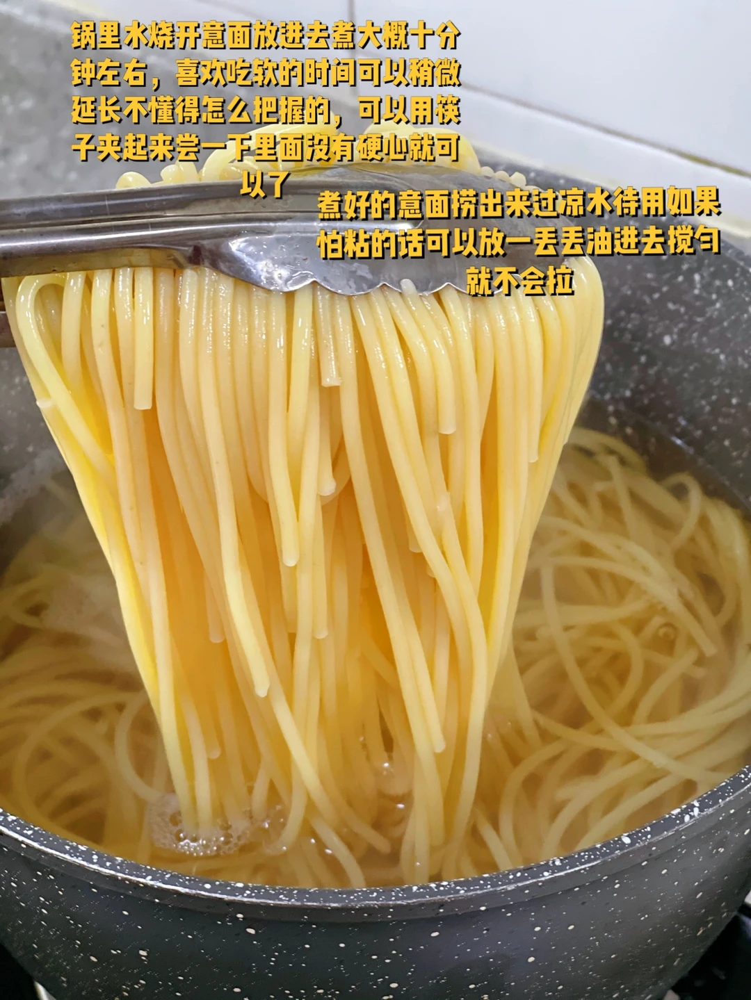 煮好的意面捞出来过凉水待用如果怕粘的话可以放一丢丢油进去搅匀就不会拉