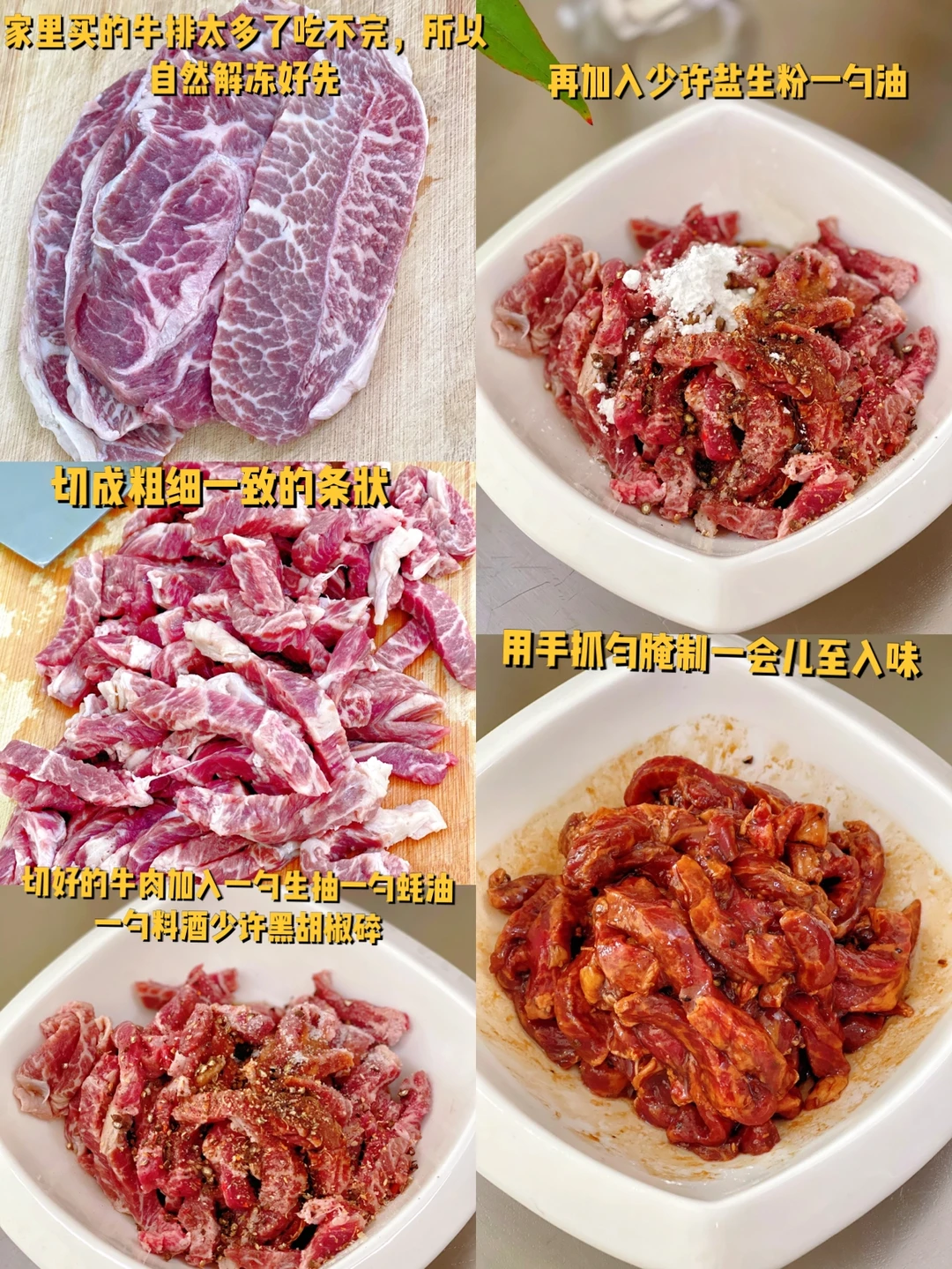 4. 切成粗细一致的条状,切好的牛肉加入一勺生抽一勺蚝油一勺料酒少许黑胡椒碎