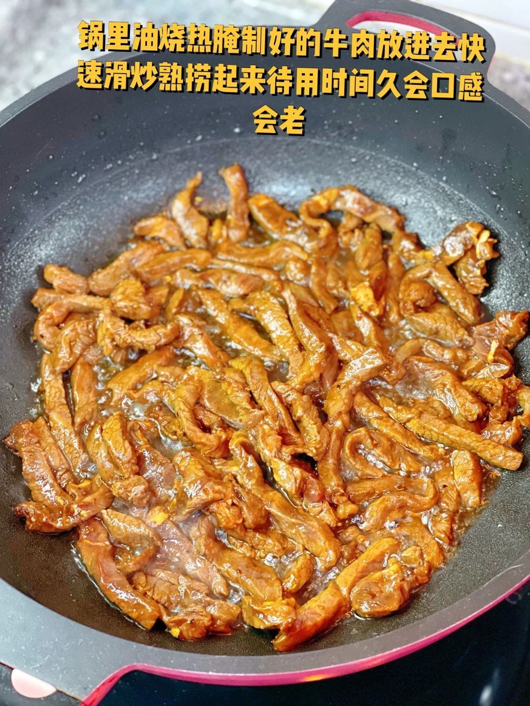 6. 锅里油烧热腌制好的牛肉放进去快速滑炒熟捞起来待用时间久会口感会老