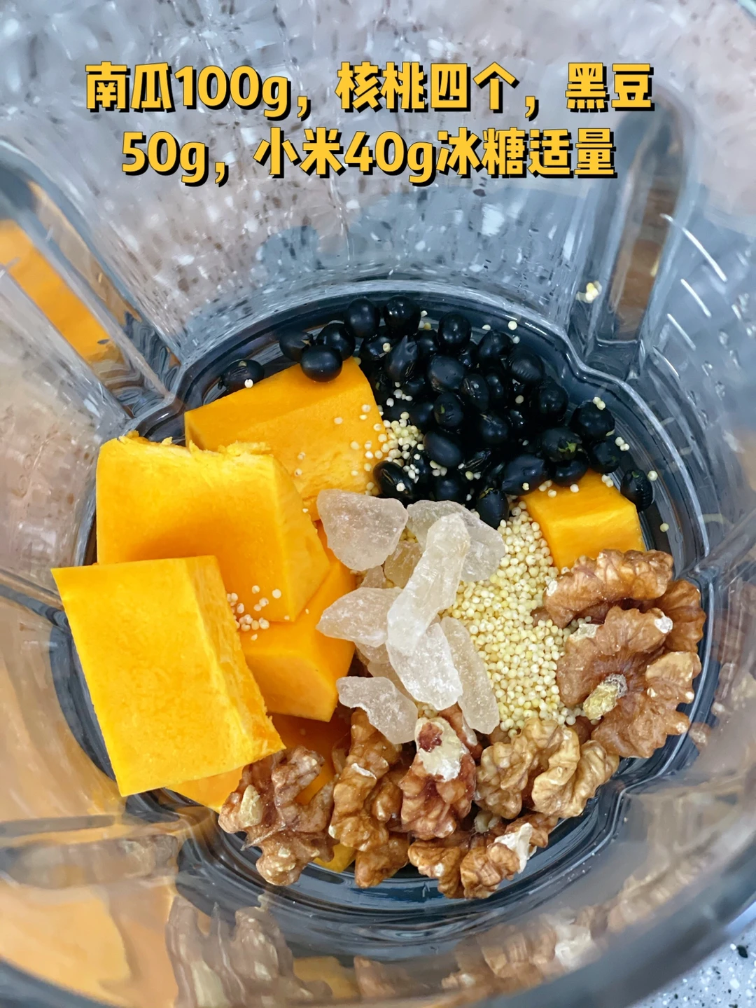 食材:南瓜100g、黑豆50g、小米40g、核桃4个 功效:乌发养发、补肾益脾,易掉发、发质差的 - -周喝2~3次。