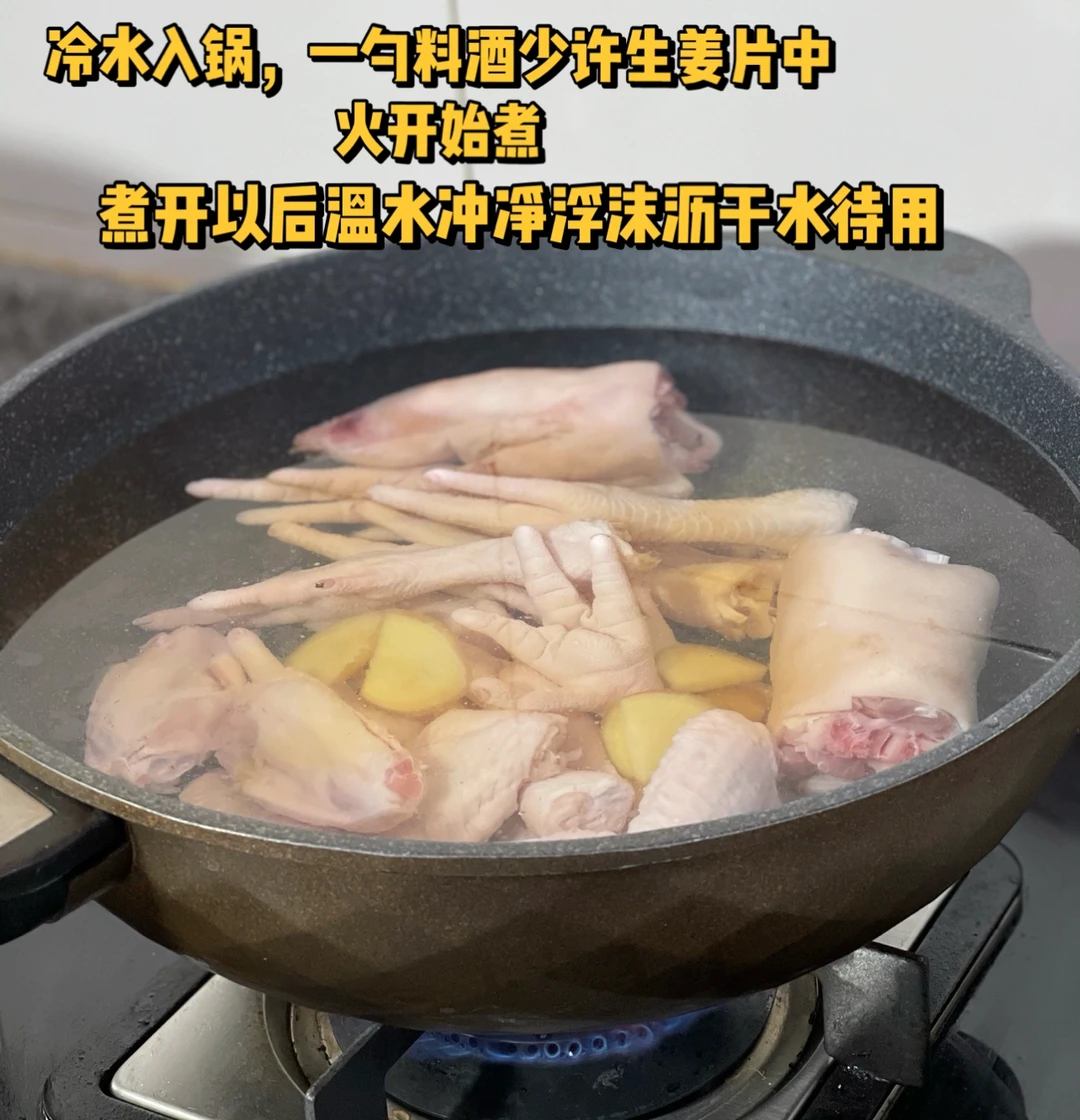 5. 卤制食材冷水入锅,一勺料酒少许生姜片中火开始煮水开了以后温水冲净浮沫哦