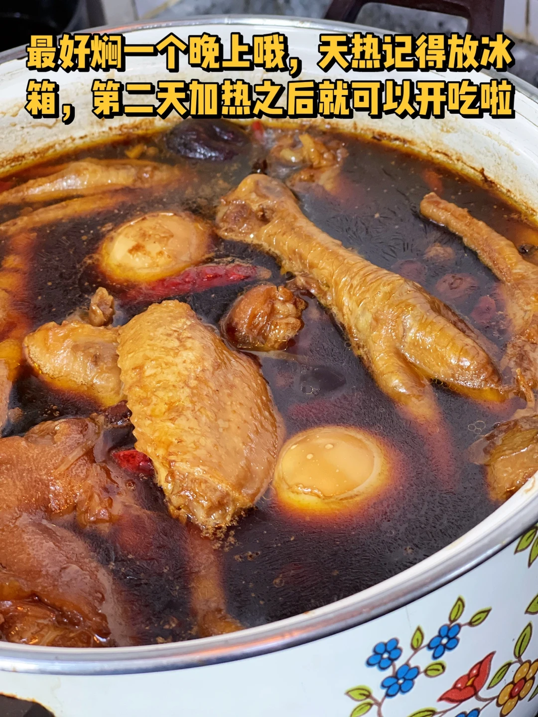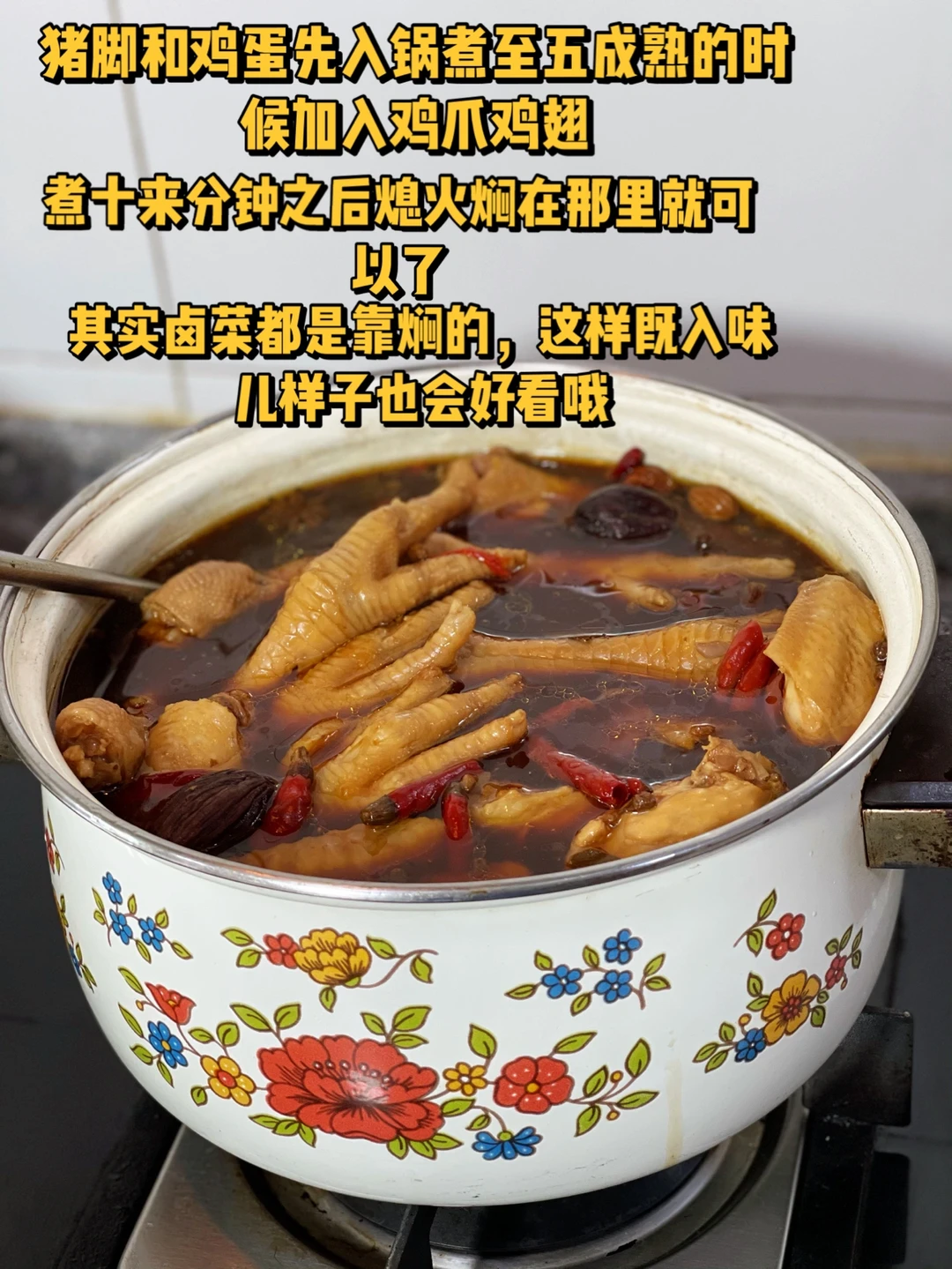 6. 猪脚和鸡蛋先入卤水锅煮至五成熟的时候加入鸡爪鸡翅,煮十来分钟之后熄火焖在那里就可以了,其实卤菜都是靠焖的,这样既入味儿样子也会好看哦
