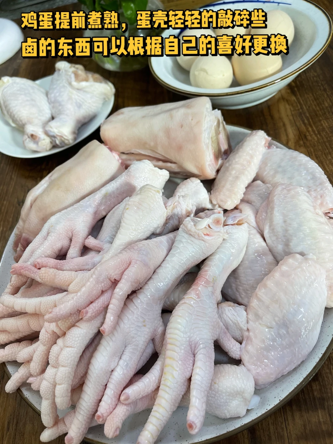 4. 鸡蛋提前煮熟,蛋壳轻轻的敲碎些,卤的东西可以根据自己的喜好更换,鸭掌鸡爪,鸡翅,猪蹄儿,猪尾巴....