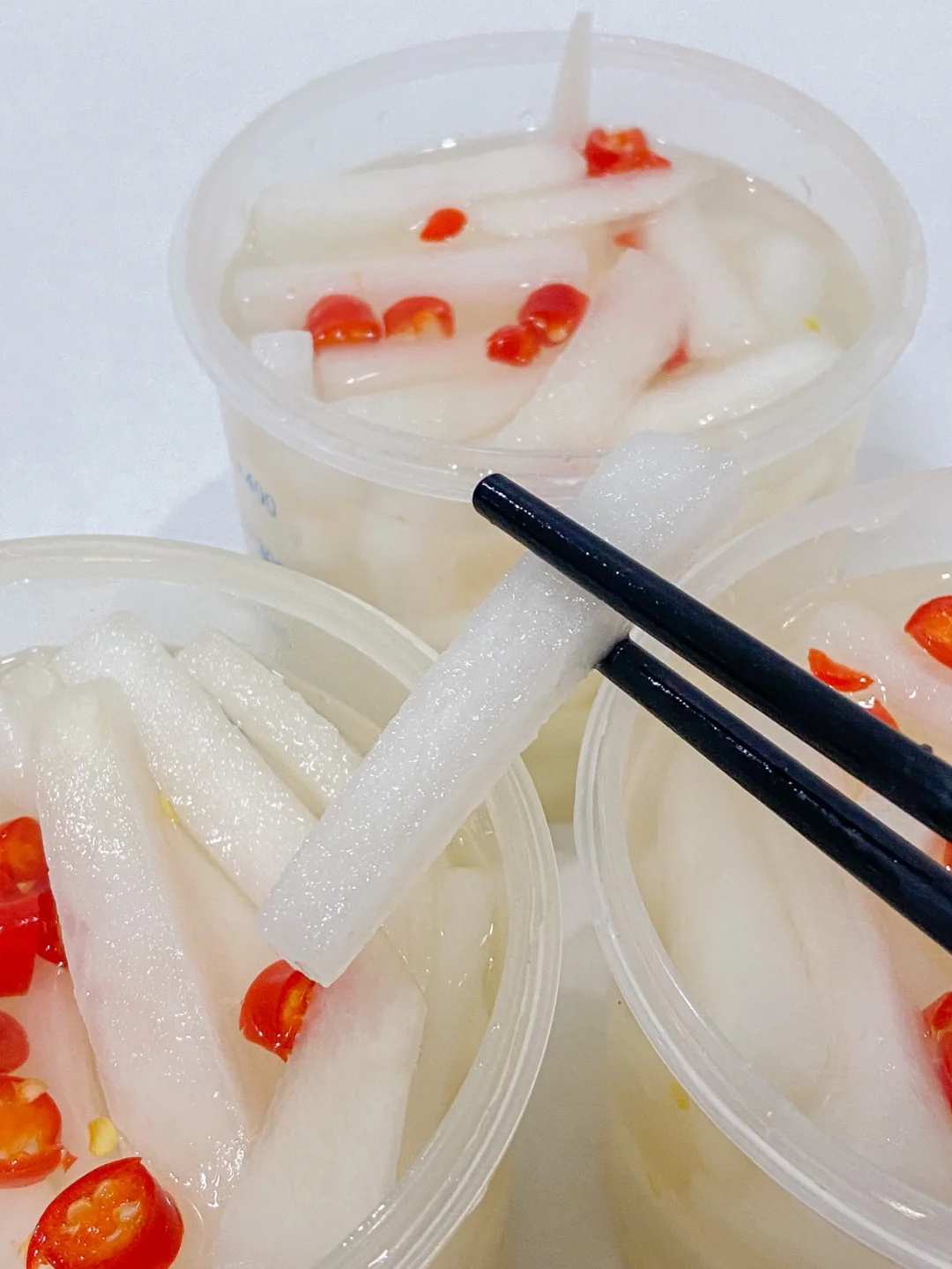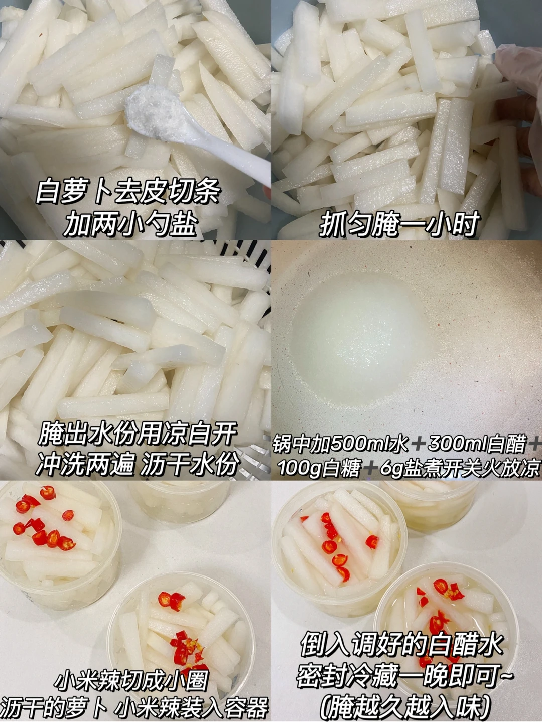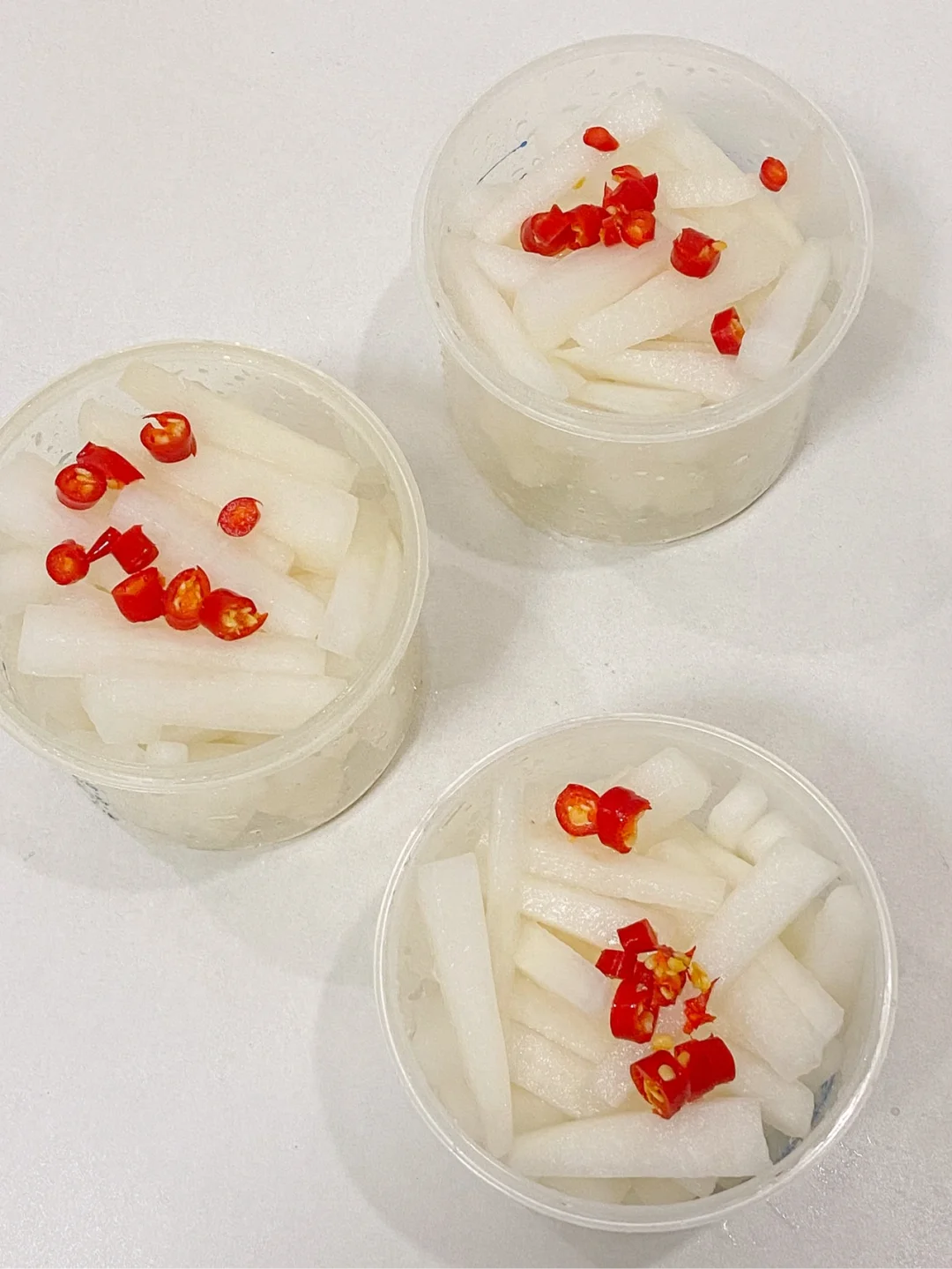 3️⃣小米辣切成小圈 沥干的萝卜装入容器 放入小米辣 倒入调好的白醋水 密封冷藏一晚即可~