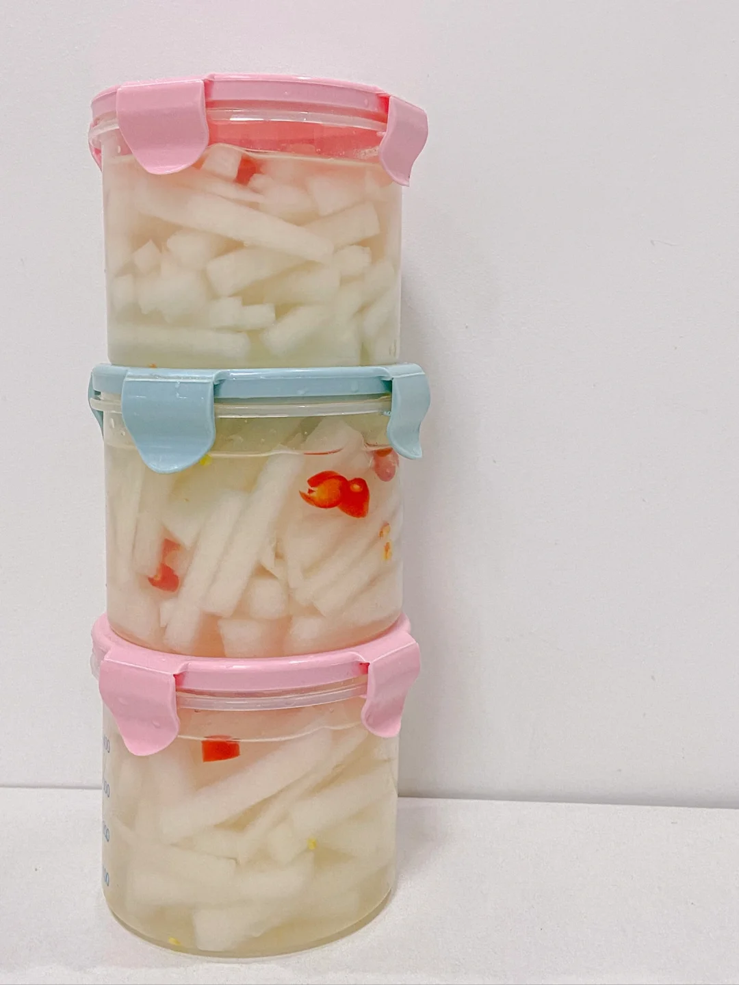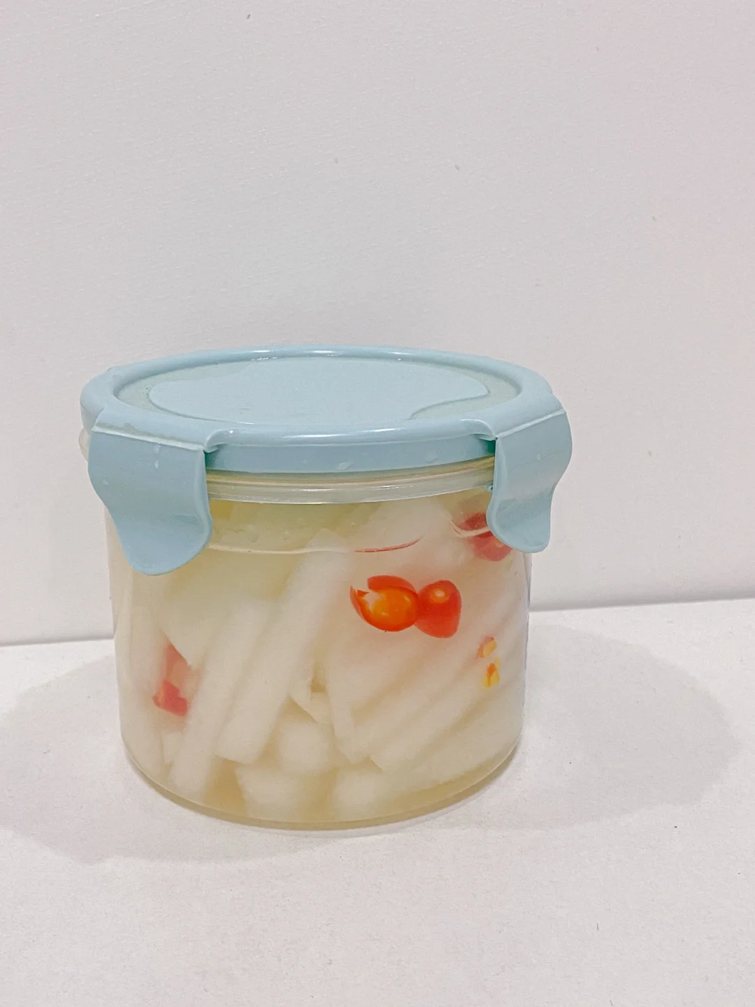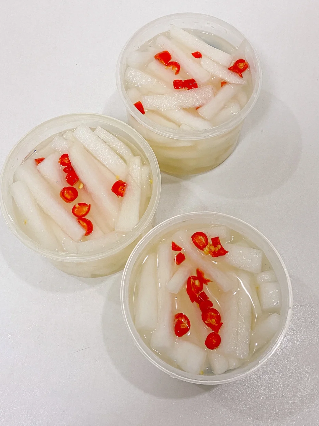 3️⃣小米辣切成小圈 沥干的萝卜装入容器 放入小米辣 倒入调好的白醋水 密封冷藏一晚即可~