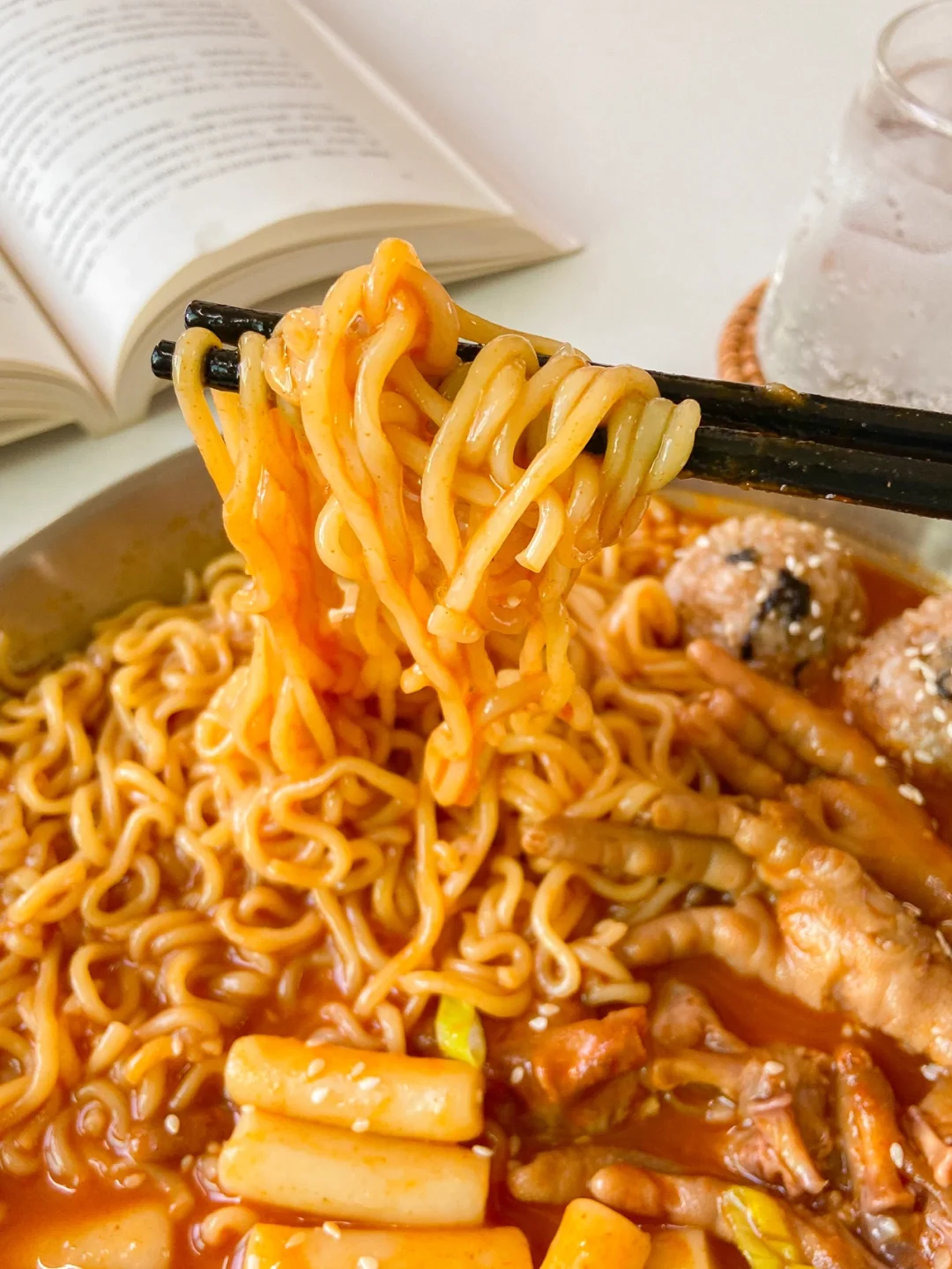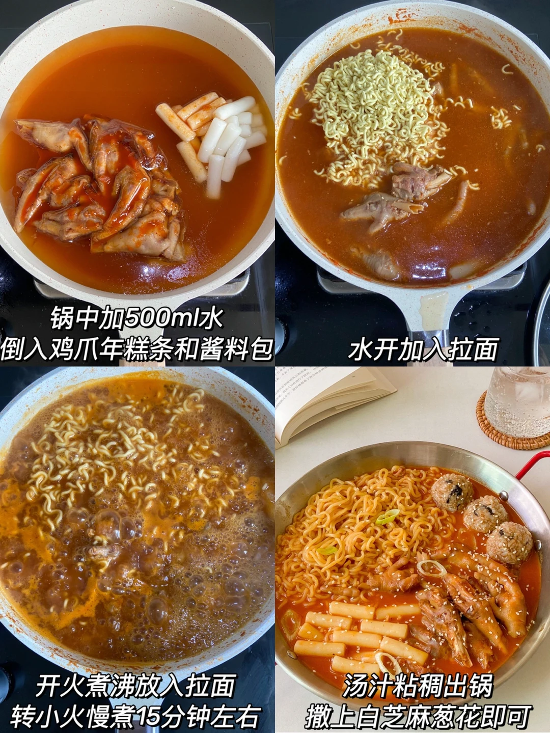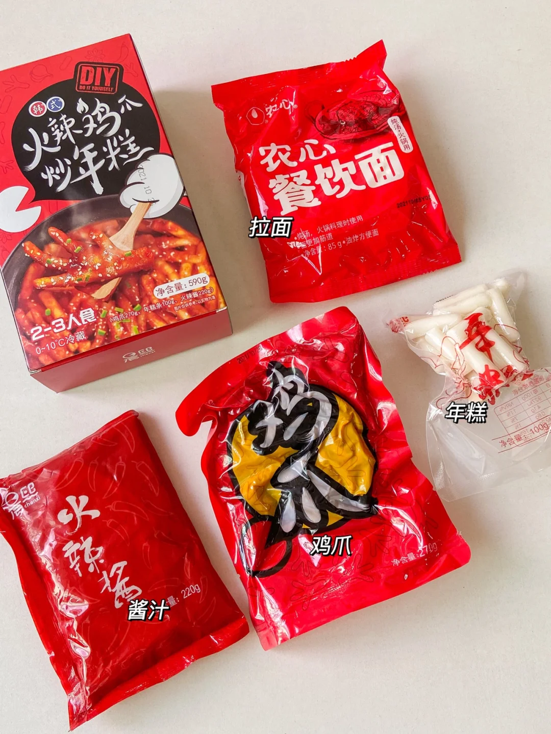 每次一追韩剧我就被剧里的拉面 年糕 辣鸡爪馋得流口水 终于还是安排上了晨熙火辣鸡爪炒年糕🤫 做法简单✨✨✨✨✨ 1️⃣锅中加500ml水倒入鸡爪年糕条和酱料包 2️⃣开火煮沸放入拉面转小火慢煮15分钟左右 汤汁粘稠即可(过程需时不时搅拌一下以免粘锅) 简单两步就可以get韩式大餐 我还加了农心拉面 葱花 白芝麻 特香~鸡爪软软糯糯的吼吼吃!年糕也糯糯叽叽的很有弹性‼️ 甜辣的口味 不过有点偏辣 怕辣的宝宝们要少放料包哦 一份鸡爪炒年糕配上一杯21年的冰雪碧 再刷个剧~阿~人生圆满😊😊😊