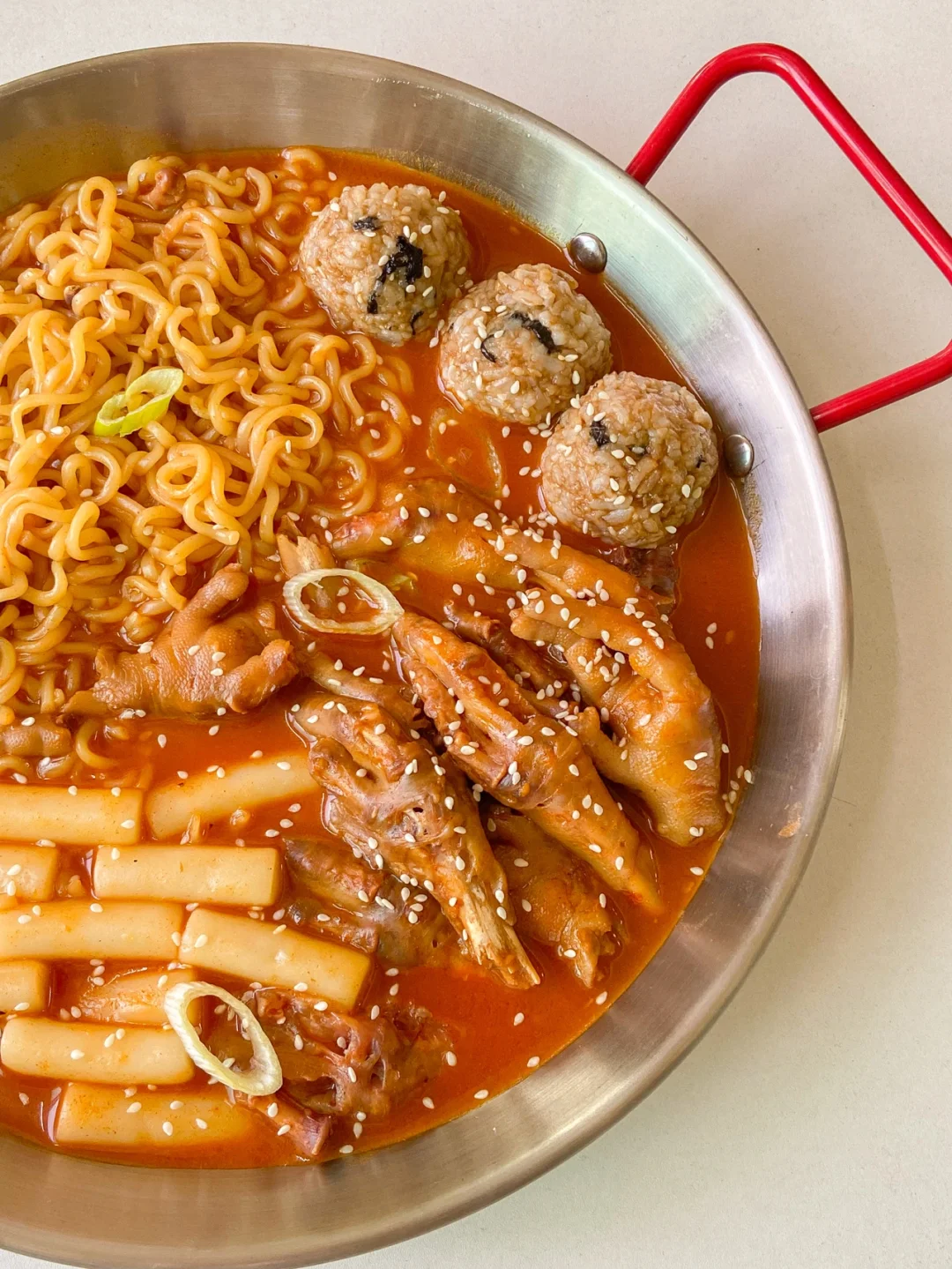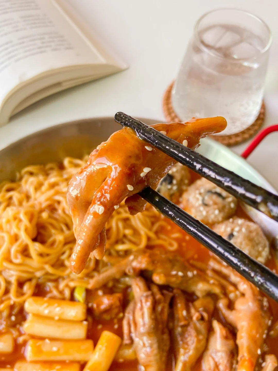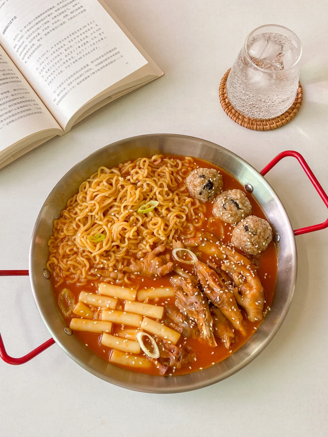 每次一追韩剧我就被剧里的拉面 年糕 辣鸡爪馋得流口水 终于还是安排上了晨熙火辣鸡爪炒年糕🤫 做法简单✨✨✨✨✨ 1️⃣锅中加500ml水倒入鸡爪年糕条和酱料包 2️⃣开火煮沸放入拉面转小火慢煮15分钟左右 汤汁粘稠即可(过程需时不时搅拌一下以免粘锅) 简单两步就可以get韩式大餐 我还加了农心拉面 葱花 白芝麻 特香~鸡爪软软糯糯的吼吼吃!年糕也糯糯叽叽的很有弹性‼️ 甜辣的口味 不过有点偏辣 怕辣的宝宝们要少放料包哦 一份鸡爪炒年糕配上一杯21年的冰雪碧 再刷个剧~阿~人生圆满😊😊😊