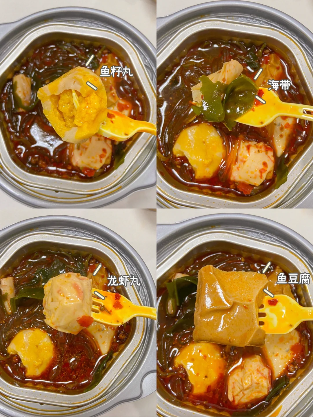 这个有惊艳到我 敲好吃 有蟹籽丸 龙虾丸还有鱼豆腐 红薯粉敲Q弹 还有我爱的海带 我特喜欢 底料是牛油锅底 还有花椒粒 不能吃辣的记得少放一点料包!是鲜香麻辣的感觉哦 就像在吃重庆火锅😘