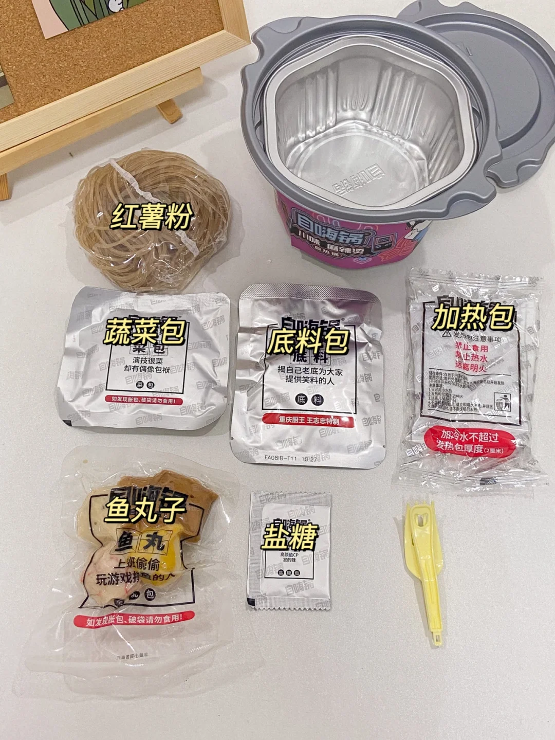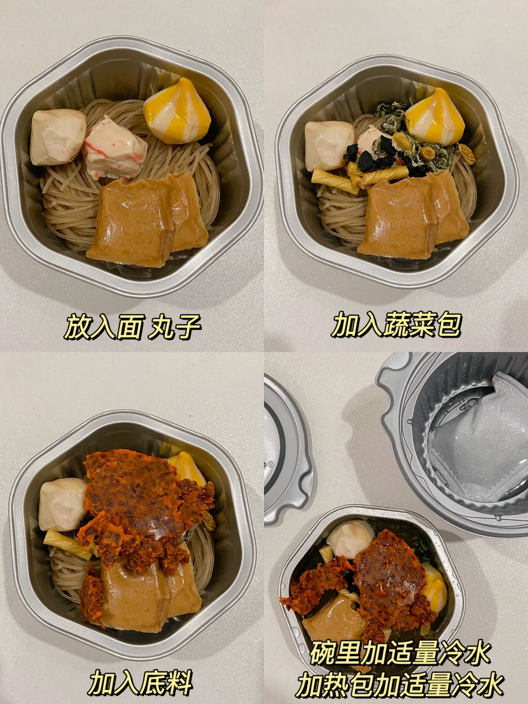 还有蒜香花蛤粉 酥麻牛肉粉 嗦哈酸辣粉 每个口味都不错~主要还适合懒人 倒出所有料包放入纯净水 底部放凉水放入加热包坐等15分钟即享美食 便捷式美食懒人赶紧🐛 一瓶冷水就可以吃到一碗巨好吃的美食 适合宿舍学生党 加班党还有我这个半夜不睡觉的追剧夜宵党😉