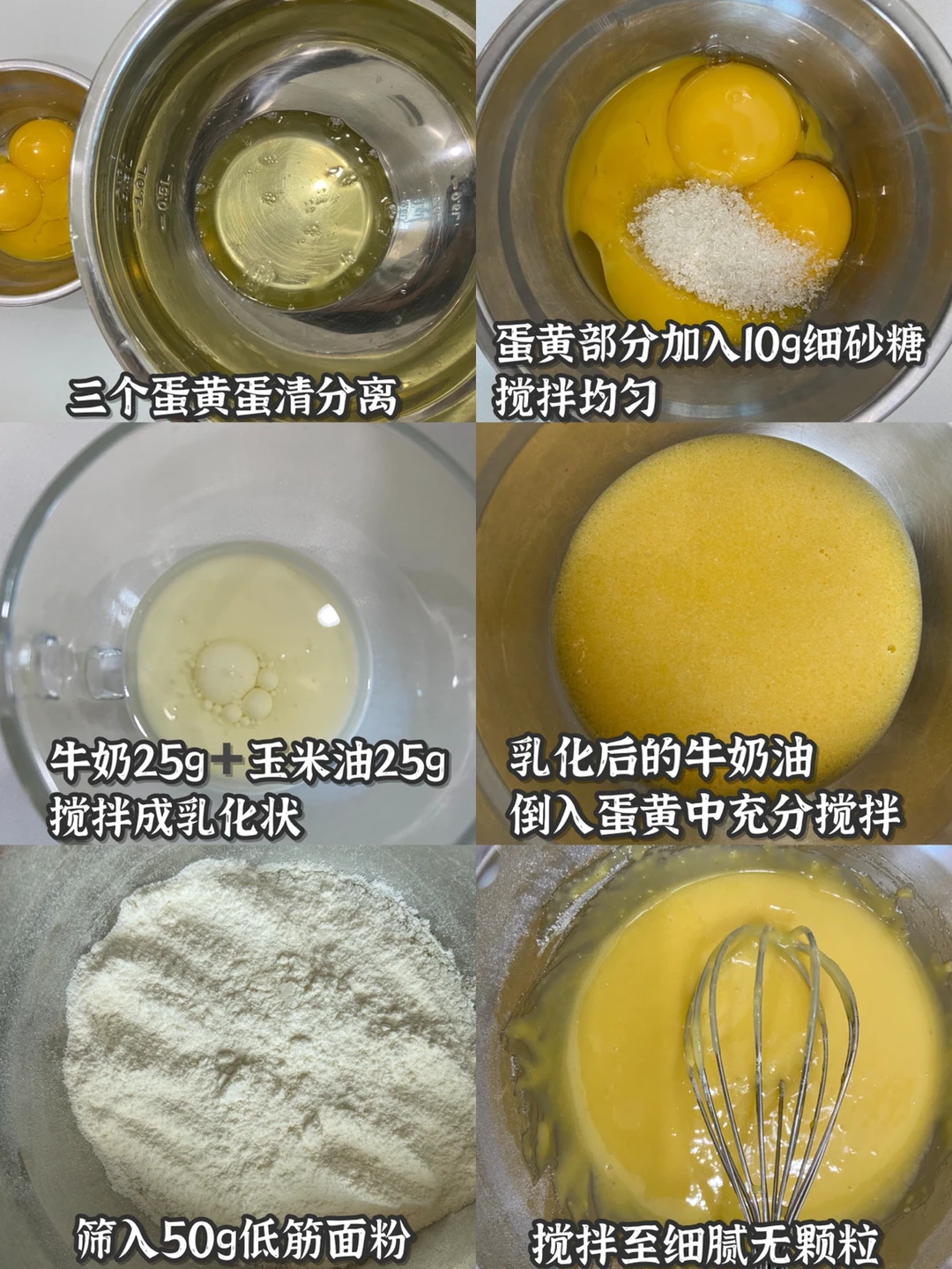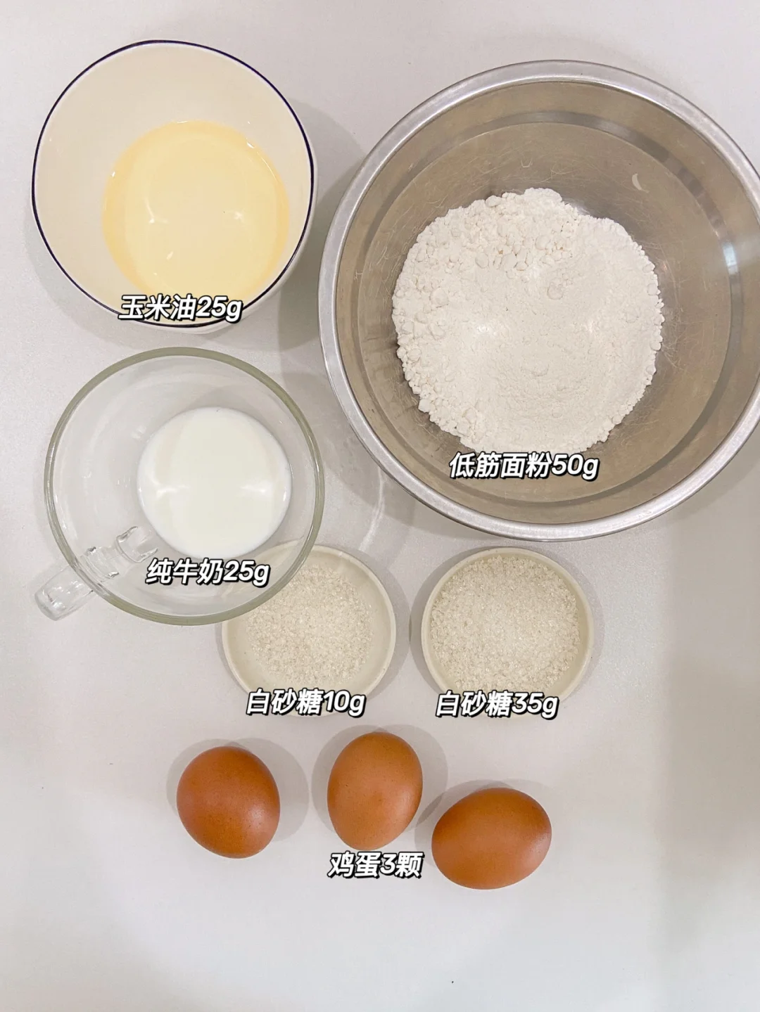 鸡蛋3个 细砂糖分10g 35g 牛奶25g 玉米油25g 低筋面粉50g