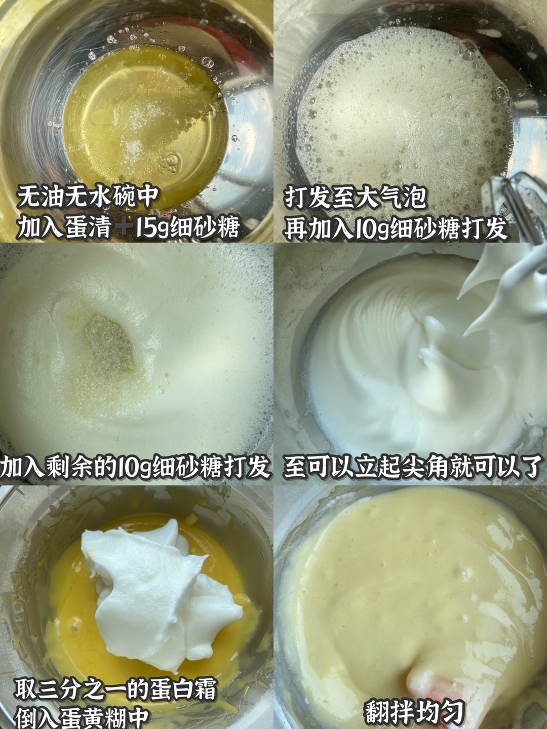 4️⃣无油无水碗中加入蛋清 加入15g细砂糖 打发至大气泡 再加入10g细砂糖打发 最后加入剩余的10g细砂糖打发至可以立起尖角就可以了
